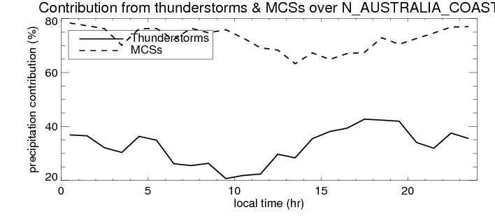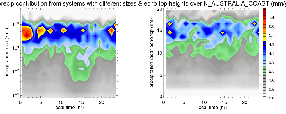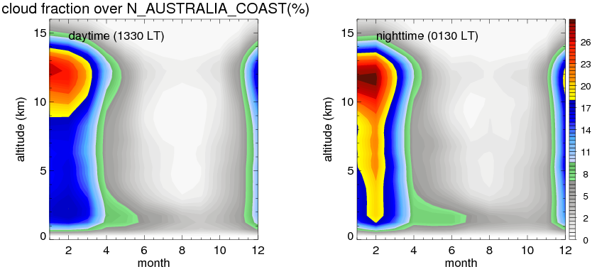 Many studies suggested that the diurnal variation of the precipitation is related to the life cycles of the precipitation systems, which is frequently driven by the surface sensible heating. Over N_AUSTRALIA_COAST, mean annual precipitation are estimated with 912.4 (mm/year) from precipitation radar. Detailed diurnal variation of the precipitation at high resolution can be accessed here (NOTE: it may take long time to generate for a large area). The diurnal variation of precipitation from systems with different sizes and heights are shown below: In total, thunderstorms (systems with detected lightning flashes) contribute 32 %, MCSs (Mesoscale convective systems with raining area > 2000 km^2) contribute 72 % of all precipitation over N_AUSTRALIA_COAST. Diurnal variations of fraction of precipitation from thunderstorms and MCSs over N_AUSTRALIA_COAST are shown below: Certainly there is a strong diurnal variation of different types of clouds. Because CloudSat observes at 0130 and 1330 local time, here the daytime and night cloud fraction in different seasons are presented: |