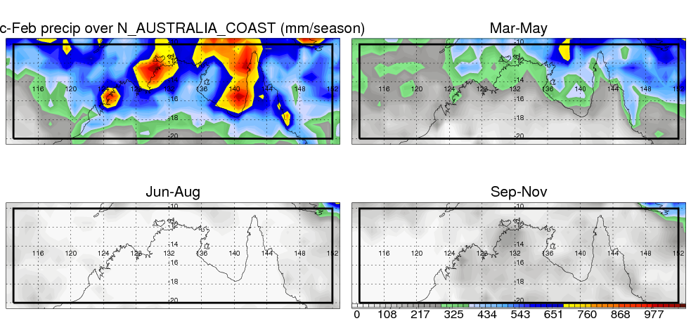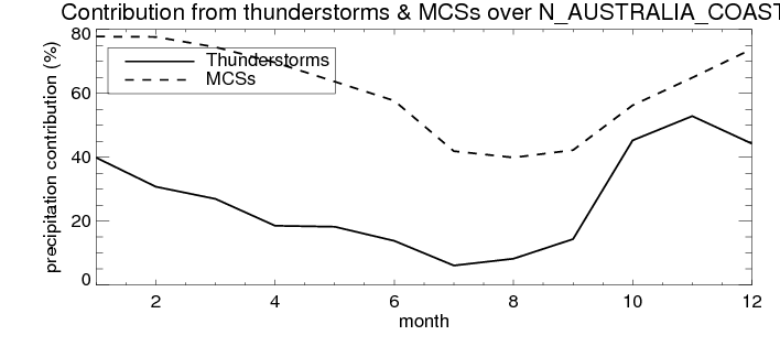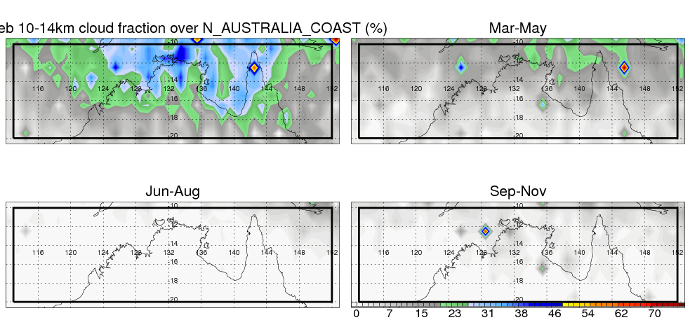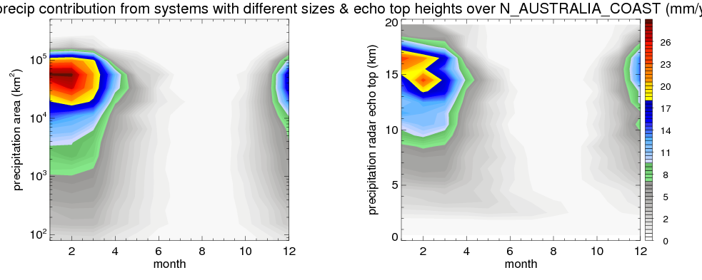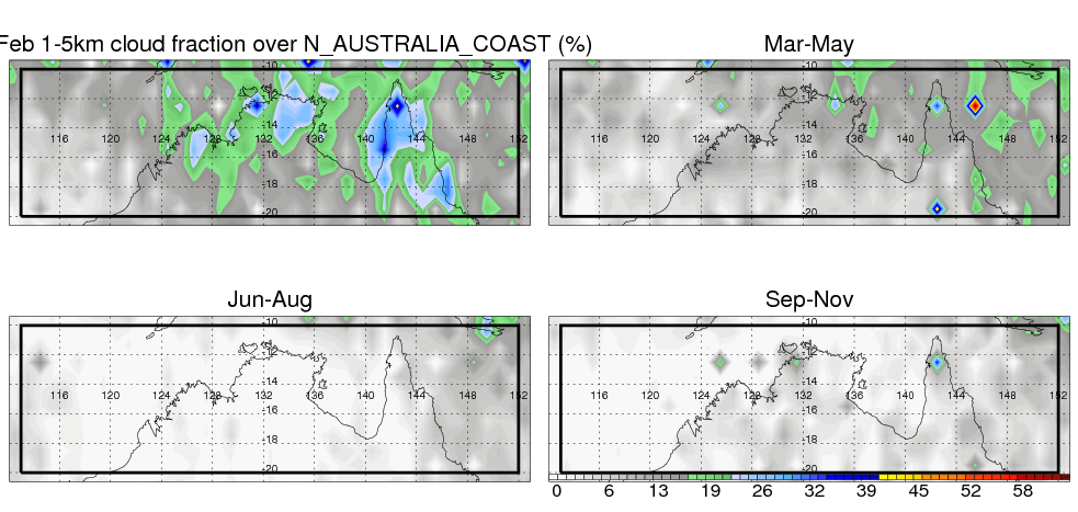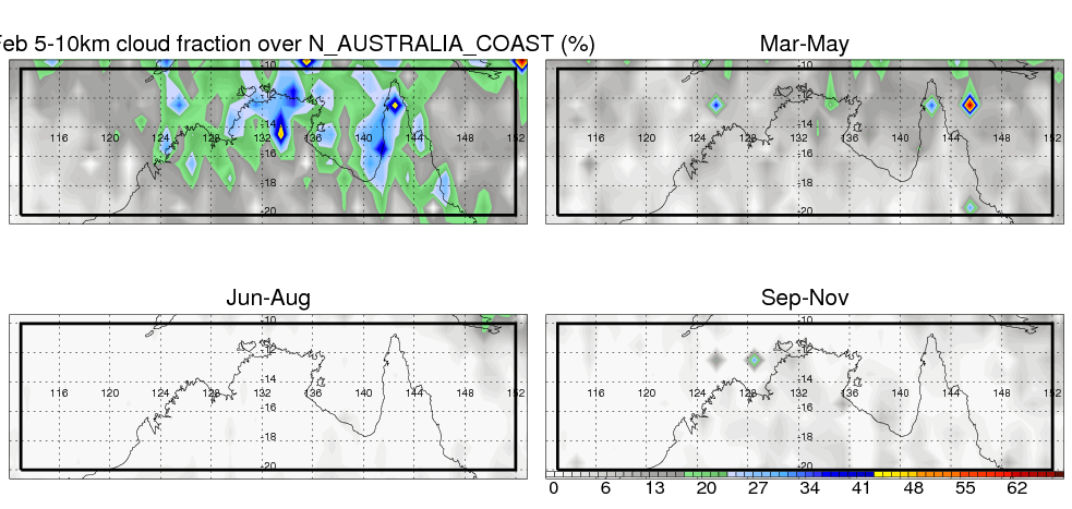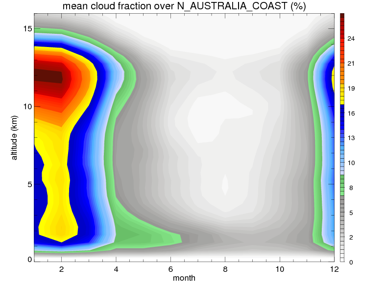 Over N_AUSTRALIA_COAST , mean annual precipitation are estimated with 912.4 (mm/year) from TRMM precipitation radar. (distribution of precipitation see here ) Total surface rainfall is brought by various precipitation systems. The seasonal variation of precipitation from systems with different sizes and heights are shown below: In total, thunderstorms (systems with detected lightning flashes) contribute 32 %, MCSs (Mesoscale convective systems with raining area > 2000 km^2) contribute 72 % of all precipitation. Seasonal variations of fraction of precipitation from thunderstorms and MCSs are shown below: The seasonal variation of geographical distribution of CloudSat cloud fraction over N_AUSTRALIA_COAST is shown below: The seasonal variation of mean CloudSat level cloud fraction at different altitudes over N_AUSTRALIA_COAST is shown below: |