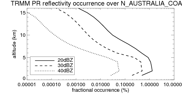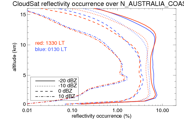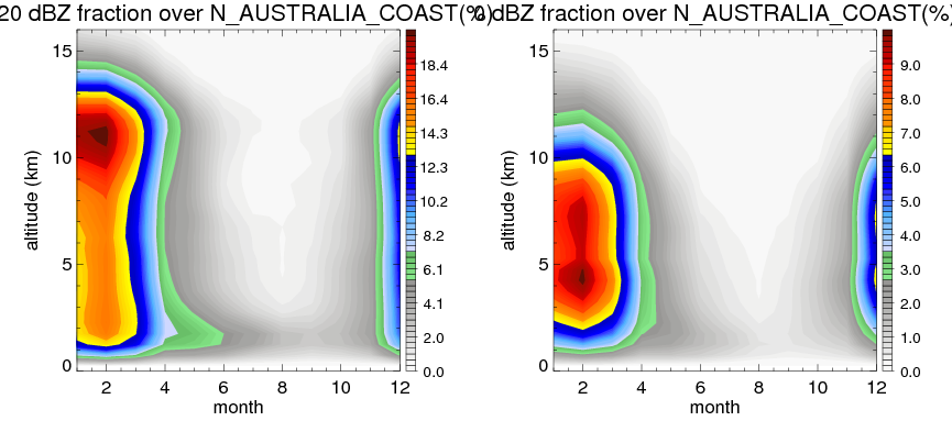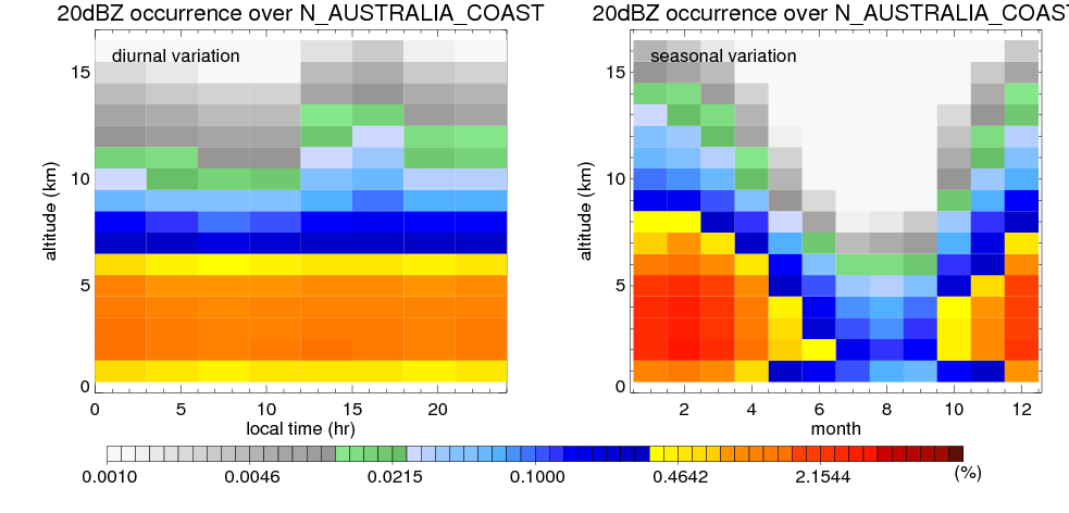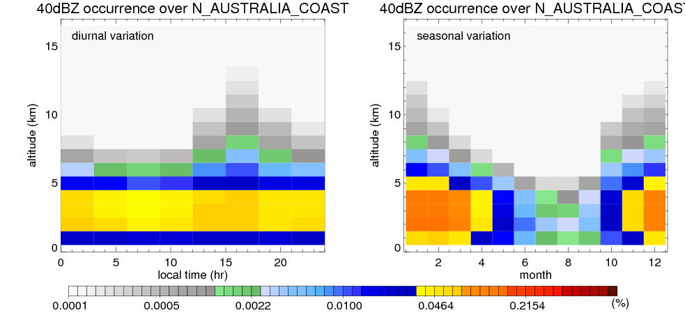 Here the precipitation means the precipitable hydrometeors (raindrops, snow flakes, graupel and hails) that detected by TRMM precipitation radar. Following figure shows the vertical profiles of 20, 30 and 40 dBZ fractional occurrence over N_AUSTRALIA_COAST in different seasons. The seasonal and diurnal variations of precipitation (20 dBZ) fractional occurrence at different altitudes are shown below: The seasonal and diurnal variations of INTENSIVE precipitation (40 dBZ) fractional occurrence at different altitudes are shown below: Clouds are consisted of small hydrometeors that undetectable by TRMM precipitation radar (Ku band). CloudSat (W band radar) provides the much great details of clouds. Following figure shows the vertical structure of the thin and thick clouds over N_AUSTRALIA_COAST. Note that high reflectivity at low levels are less frequent due to the attenuation. The seasonal variation of thin (-20 dBZ) and thick (0 dBZ) cloud over N_AUSTRALIA_COAST are shown below: |