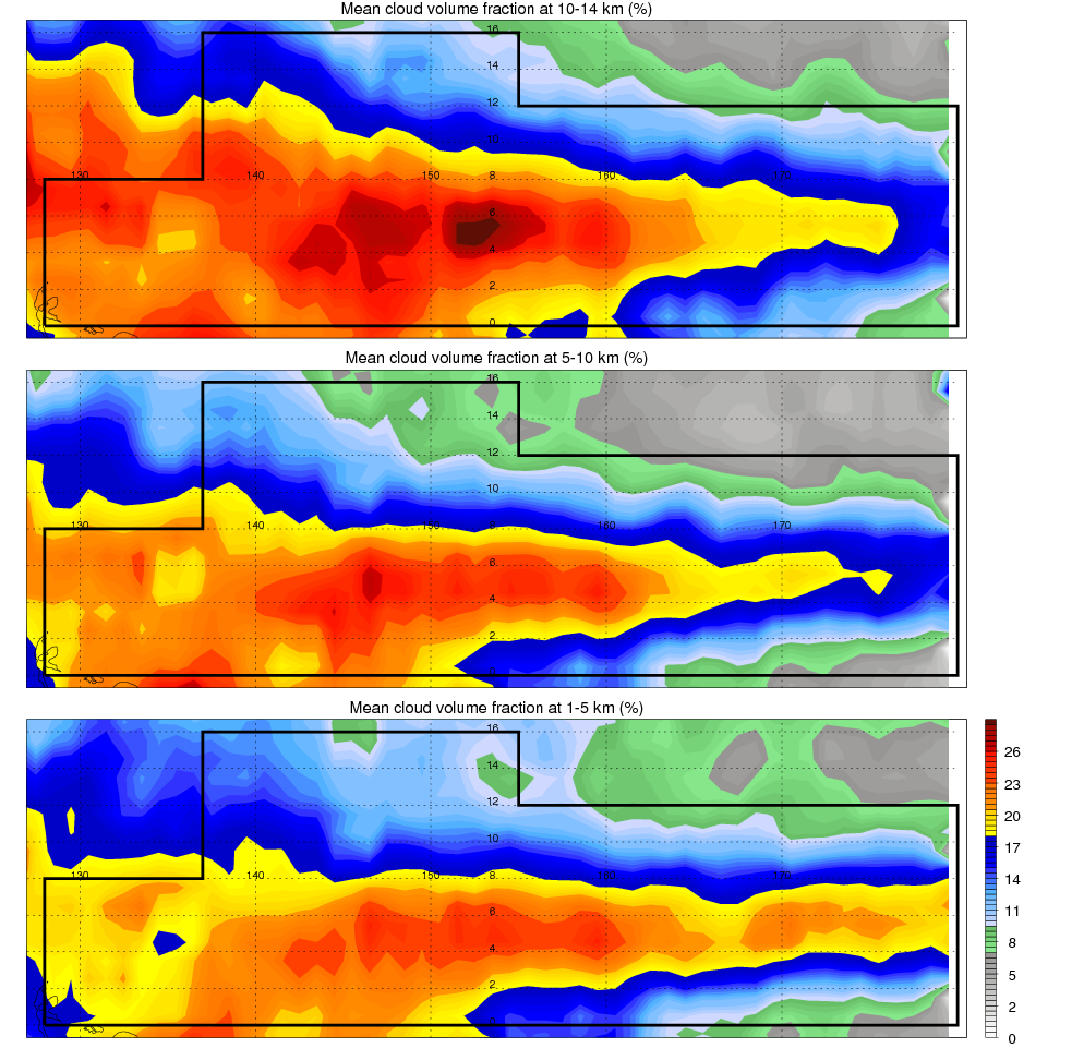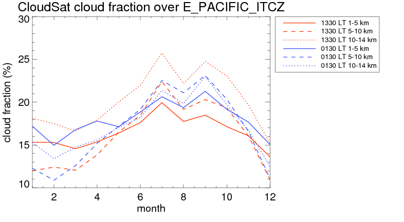 Over E_PACIFIC_ITCZ , mean high level (10-14 km) cloud volume fraction is about 19.3%. Mean mid level (5-10 km) cloud volume fraction is about 16.7%. Mean low level (1-5 km) cloud volume fraction is about 17.2%. Seasonal and day vs. night variations of high, mid and low level cloud fraction over E_PACIFIC_ITCZ are shown in following figure. You may check the details of cloud fraction in various seasons and at different local times. |