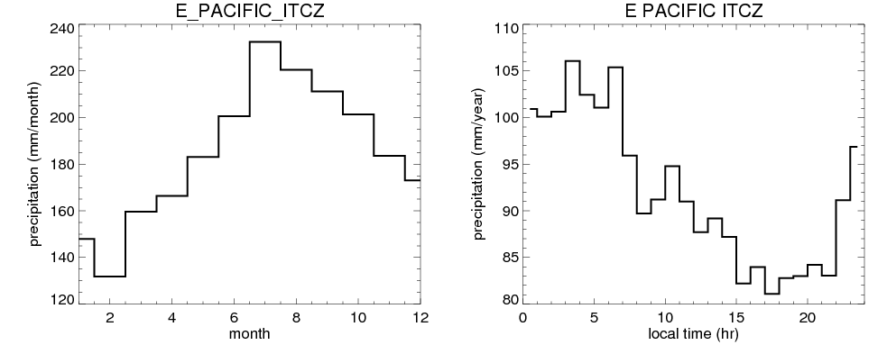 Over E_PACIFIC_ITCZ , mean annual precipitation are estimated with 2211.7 (mm/year) from precipitation radar, and 2177.7 (mm/year) from microwave radiometer observations. (see high resolution precipitation product , NOTE: it may take long time to generate for large area) In total, thunderstorms (systems with detected lightning flashes) contribute 7 %, MCSs (Mesoscale convective systems with raining area > 2000 km^2) contribute 67 % of all precipitation. Seasonal and diurnal variations of rainfall over E_PACIFIC_ITCZ are shown in following figure. You may check the details of rainfall contributions from precipitation systems with different sizes and intensities in various seasons and at different local times. |