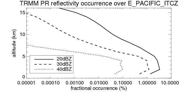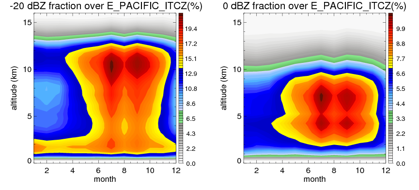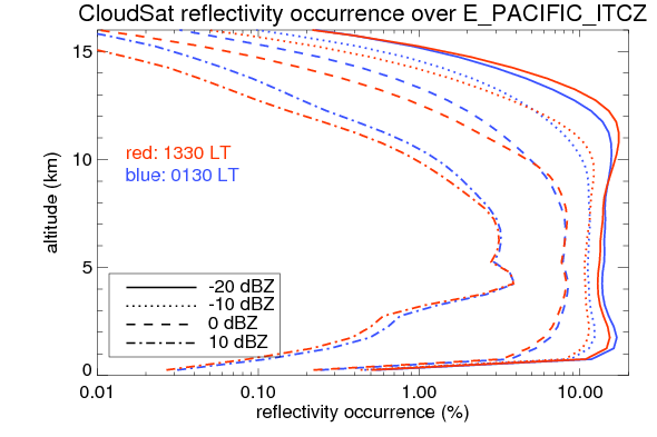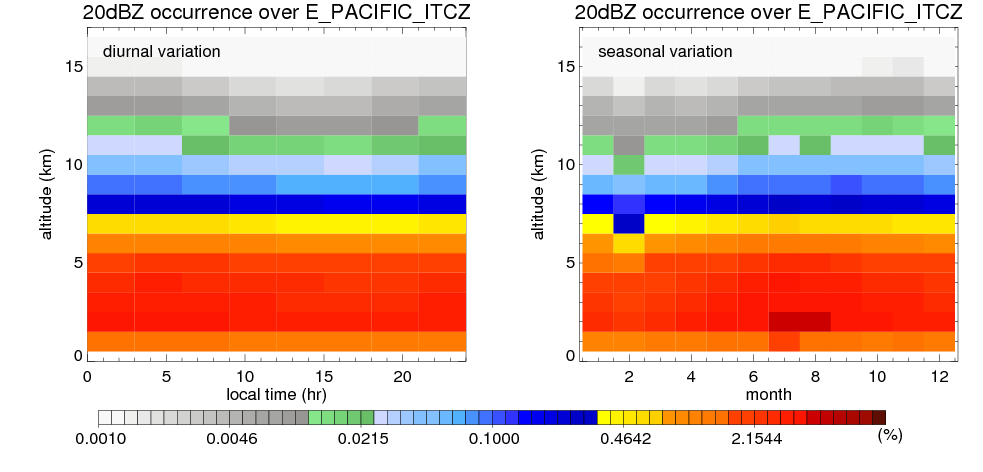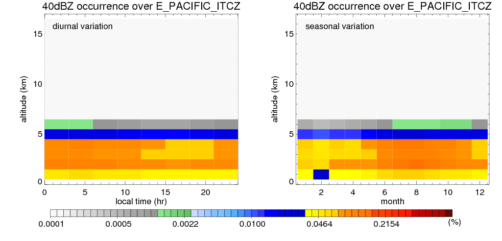 Here the precipitation means the precipitable hydrometeors (raindrops, snow flakes, graupel and hails) that detected by TRMM precipitation radar. Following figure shows the vertical profiles of 20, 30 and 40 dBZ fractional occurrence over E_PACIFIC_ITCZ in different seasons. The seasonal and diurnal variations of precipitation (20 dBZ) fractional occurrence at different altitudes are shown below: The seasonal and diurnal variations of INTENSIVE precipitation (40 dBZ) fractional occurrence at different altitudes are shown below: Clouds are consisted of small hydrometeors that undetectable by TRMM precipitation radar (Ku band). CloudSat (W band radar) provides the much great details of clouds. Following figure shows the vertical structure of the thin and thick clouds over E_PACIFIC_ITCZ. Note that high reflectivity at low levels are less frequent due to the attenuation. The seasonal variation of thin (-20 dBZ) and thick (0 dBZ) cloud over E_PACIFIC_ITCZ are shown below: |