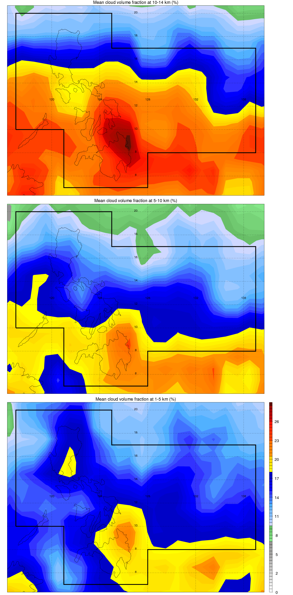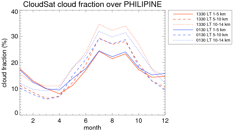 Over PHILIPINE , mean high level (10-14 km) cloud volume fraction is about 20.8%. Mean mid level (5-10 km) cloud volume fraction is about 16.6%. Mean low level (1-5 km) cloud volume fraction is about 16.6%. Seasonal and day vs. night variations of high, mid and low level cloud fraction over PHILIPINE are shown in following figure. You may check the details of cloud fraction in various seasons and at different local times. |