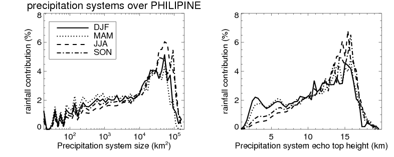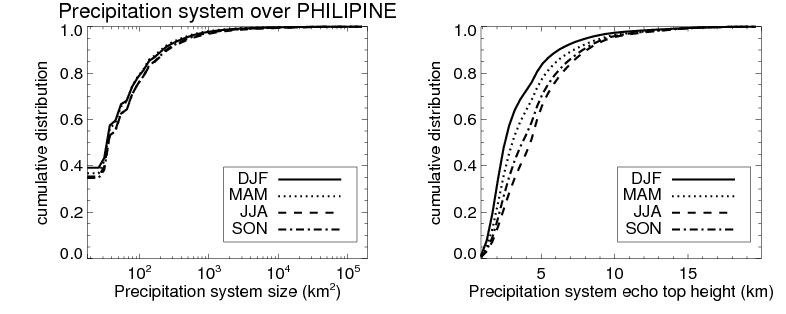 Over PHILIPINE , mean size of precipitation system about 277.5 (km^2) and mean maximum radar echo top height of these precipitation systems is about 4.5 km. Following figure shows the cumulative distribution of the sizes and depths of the precipitation systems in different seasons: Though usually there are more small systems, the larger systems would bring more total precipitation. |
