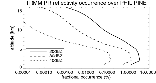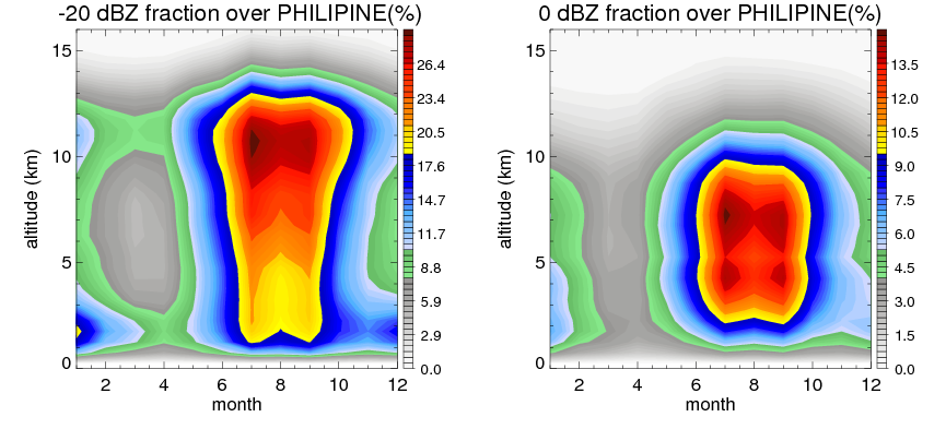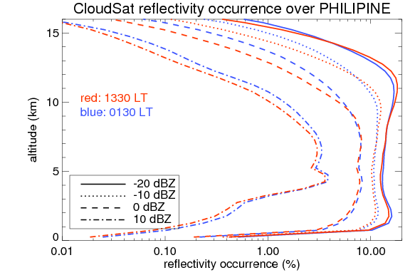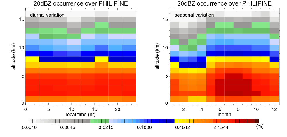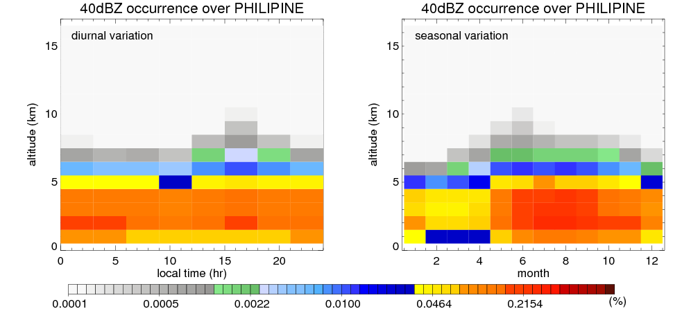 Here the precipitation means the precipitable hydrometeors (raindrops, snow flakes, graupel and hails) that detected by TRMM precipitation radar. Following figure shows the vertical profiles of 20, 30 and 40 dBZ fractional occurrence over PHILIPINE in different seasons. The seasonal and diurnal variations of precipitation (20 dBZ) fractional occurrence at different altitudes are shown below: The seasonal and diurnal variations of INTENSIVE precipitation (40 dBZ) fractional occurrence at different altitudes are shown below: Clouds are consisted of small hydrometeors that undetectable by TRMM precipitation radar (Ku band). CloudSat (W band radar) provides the much great details of clouds. Following figure shows the vertical structure of the thin and thick clouds over PHILIPINE. Note that high reflectivity at low levels are less frequent due to the attenuation. The seasonal variation of thin (-20 dBZ) and thick (0 dBZ) cloud over PHILIPINE are shown below: |
