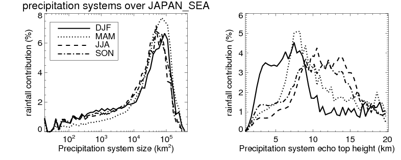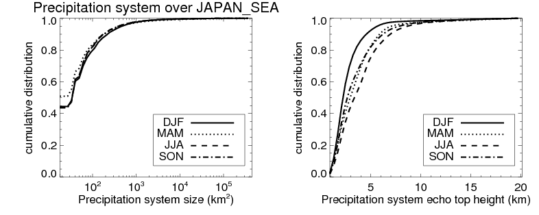 Over JAPAN_SEA , mean size of precipitation system about 362.4 (km^2) and mean maximum radar echo top height of these precipitation systems is about 3.7 km. Following figure shows the cumulative distribution of the sizes and depths of the precipitation systems in different seasons: Though usually there are more small systems, the larger systems would bring more total precipitation. |