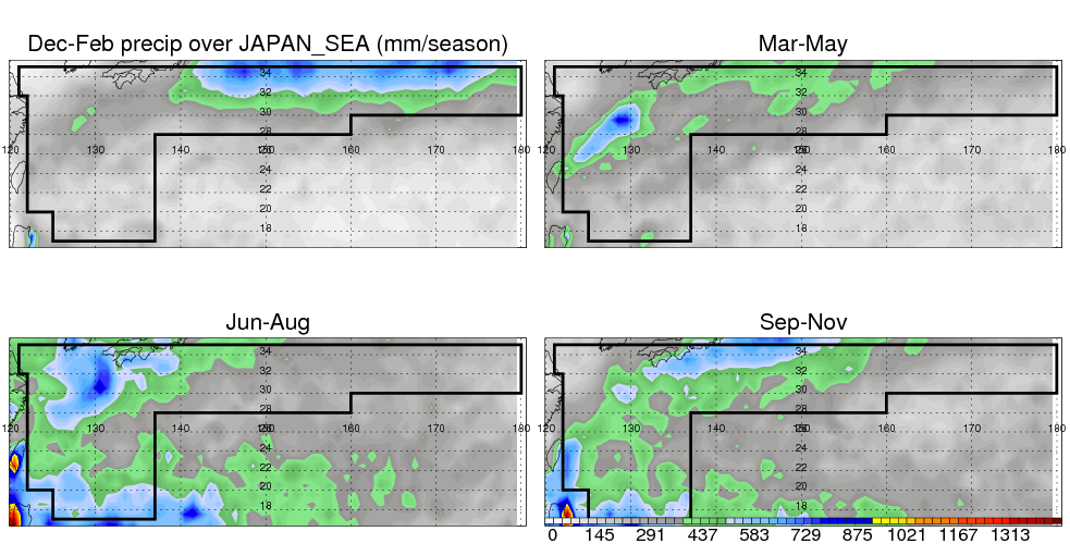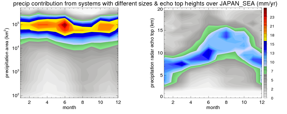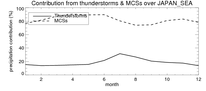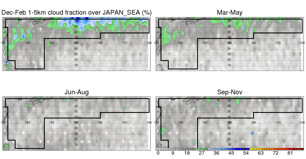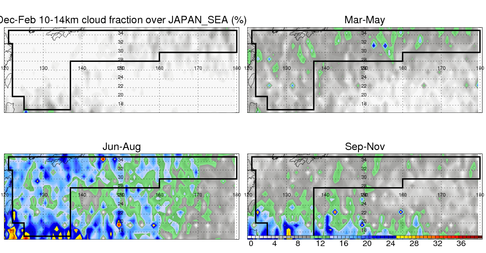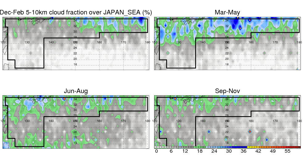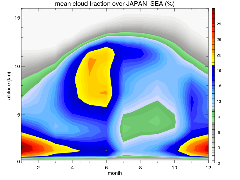Over JAPAN_SEA , mean annual precipitation are estimated with 1431.4 (mm/year) from TRMM precipitation radar. (distribution of precipitation see here ) Total surface rainfall is brought by various precipitation systems. The seasonal variation of precipitation from systems with different sizes and heights are shown below: In total, thunderstorms (systems with detected lightning flashes) contribute 18 %, MCSs (Mesoscale convective systems with raining area > 2000 km^2) contribute 82 % of all precipitation. Seasonal variations of fraction of precipitation from thunderstorms and MCSs are shown below: The seasonal variation of geographical distribution of CloudSat cloud fraction over JAPAN_SEA is shown below: The seasonal variation of mean CloudSat level cloud fraction at different altitudes over JAPAN_SEA is shown below: |