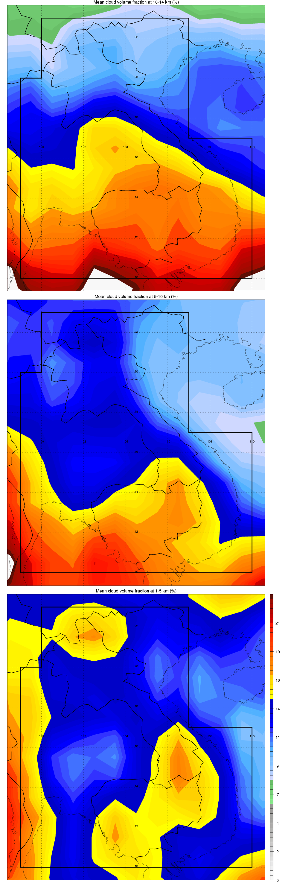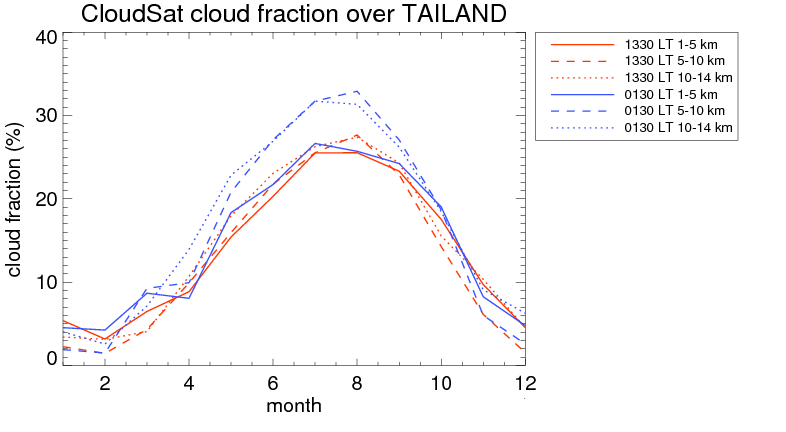 Over TAILAND , mean high level (10-14 km) cloud volume fraction is about 15.7%. Mean mid level (5-10 km) cloud volume fraction is about 14.6%. Mean low level (1-5 km) cloud volume fraction is about 14.6%. Seasonal and day vs. night variations of high, mid and low level cloud fraction over TAILAND are shown in following figure. You may check the details of cloud fraction in various seasons and at different local times. |