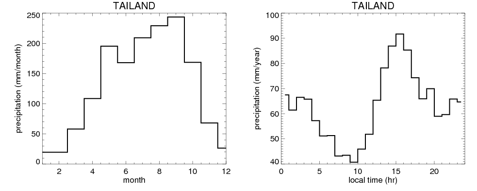 Over TAILAND , mean annual precipitation are estimated with 1513.3 (mm/year) from precipitation radar, and 1262.5 (mm/year) from microwave radiometer observations. (see high resolution precipitation product , NOTE: it may take long time to generate for large area) In total, thunderstorms (systems with detected lightning flashes) contribute 51 %, MCSs (Mesoscale convective systems with raining area > 2000 km^2) contribute 69 % of all precipitation. Seasonal and diurnal variations of rainfall over TAILAND are shown in following figure. You may check the details of rainfall contributions from precipitation systems with different sizes and intensities in various seasons and at different local times. |