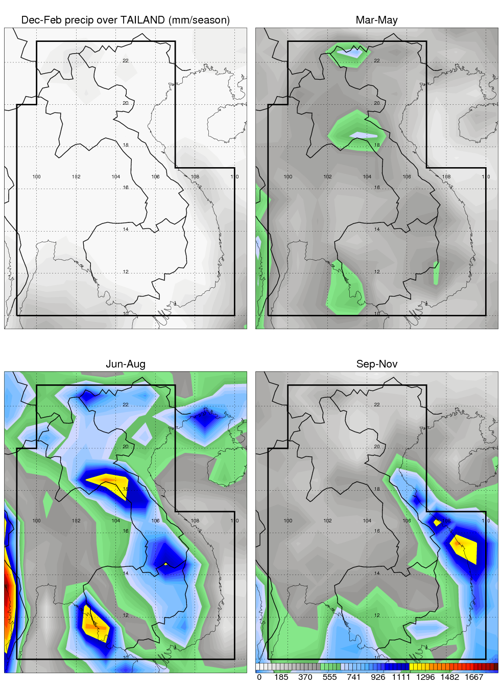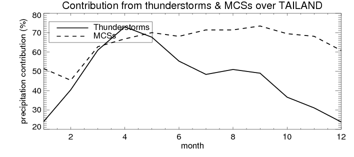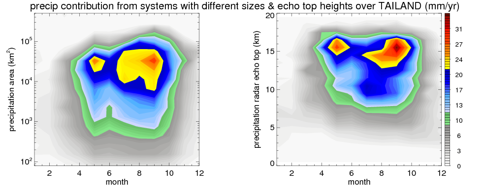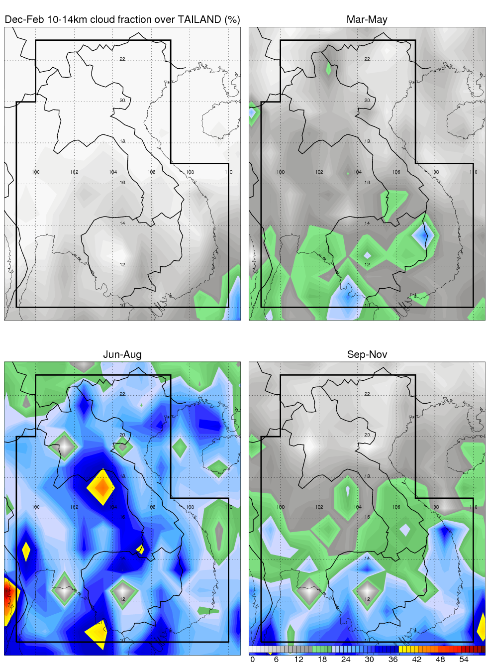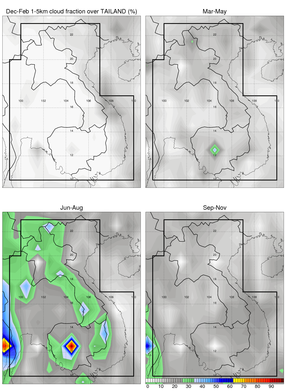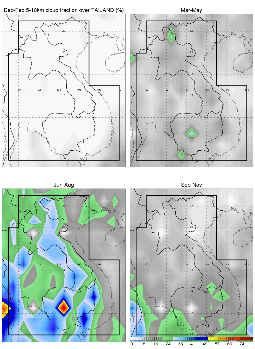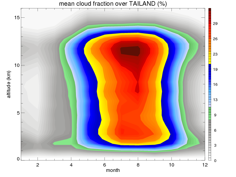 Over TAILAND , mean annual precipitation are estimated with 1513.3 (mm/year) from TRMM precipitation radar. (distribution of precipitation see here ) Total surface rainfall is brought by various precipitation systems. The seasonal variation of precipitation from systems with different sizes and heights are shown below: In total, thunderstorms (systems with detected lightning flashes) contribute 51 %, MCSs (Mesoscale convective systems with raining area > 2000 km^2) contribute 69 % of all precipitation. Seasonal variations of fraction of precipitation from thunderstorms and MCSs are shown below: The seasonal variation of geographical distribution of CloudSat cloud fraction over TAILAND is shown below: The seasonal variation of mean CloudSat level cloud fraction at different altitudes over TAILAND is shown below: |