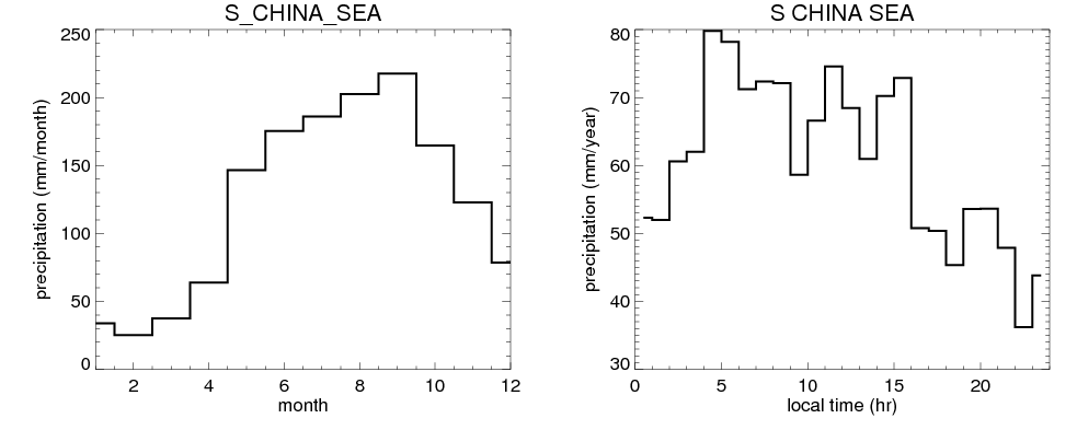 Over S_CHINA_SEA , mean annual precipitation are estimated with 1454.5 (mm/year) from precipitation radar, and 1422.8 (mm/year) from microwave radiometer observations. (see high resolution precipitation product , NOTE: it may take long time to generate for large area) In total, thunderstorms (systems with detected lightning flashes) contribute 40 %, MCSs (Mesoscale convective systems with raining area > 2000 km^2) contribute 75 % of all precipitation. Seasonal and diurnal variations of rainfall over S_CHINA_SEA are shown in following figure. You may check the details of rainfall contributions from precipitation systems with different sizes and intensities in various seasons and at different local times. |