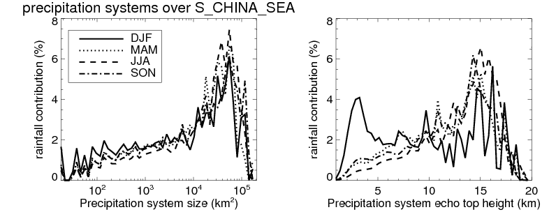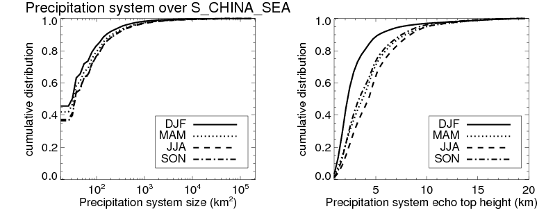 Over S_CHINA_SEA , mean size of precipitation system about 304.7 (km^2) and mean maximum radar echo top height of these precipitation systems is about 4.5 km. Following figure shows the cumulative distribution of the sizes and depths of the precipitation systems in different seasons: Though usually there are more small systems, the larger systems would bring more total precipitation. |