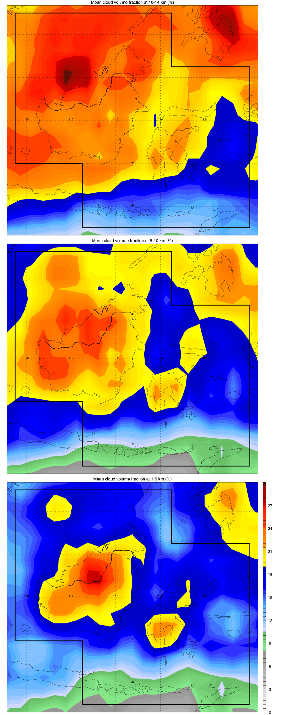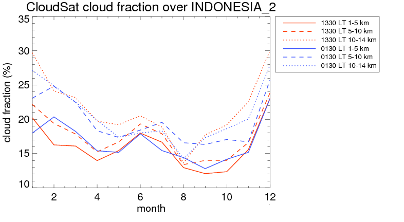 Over INDONESIA_2 , mean high level (10-14 km) cloud volume fraction is about 20.8%. Mean mid level (5-10 km) cloud volume fraction is about 18.2%. Mean low level (1-5 km) cloud volume fraction is about 16.1%. Seasonal and day vs. night variations of high, mid and low level cloud fraction over INDONESIA_2 are shown in following figure. You may check the details of cloud fraction in various seasons and at different local times. |