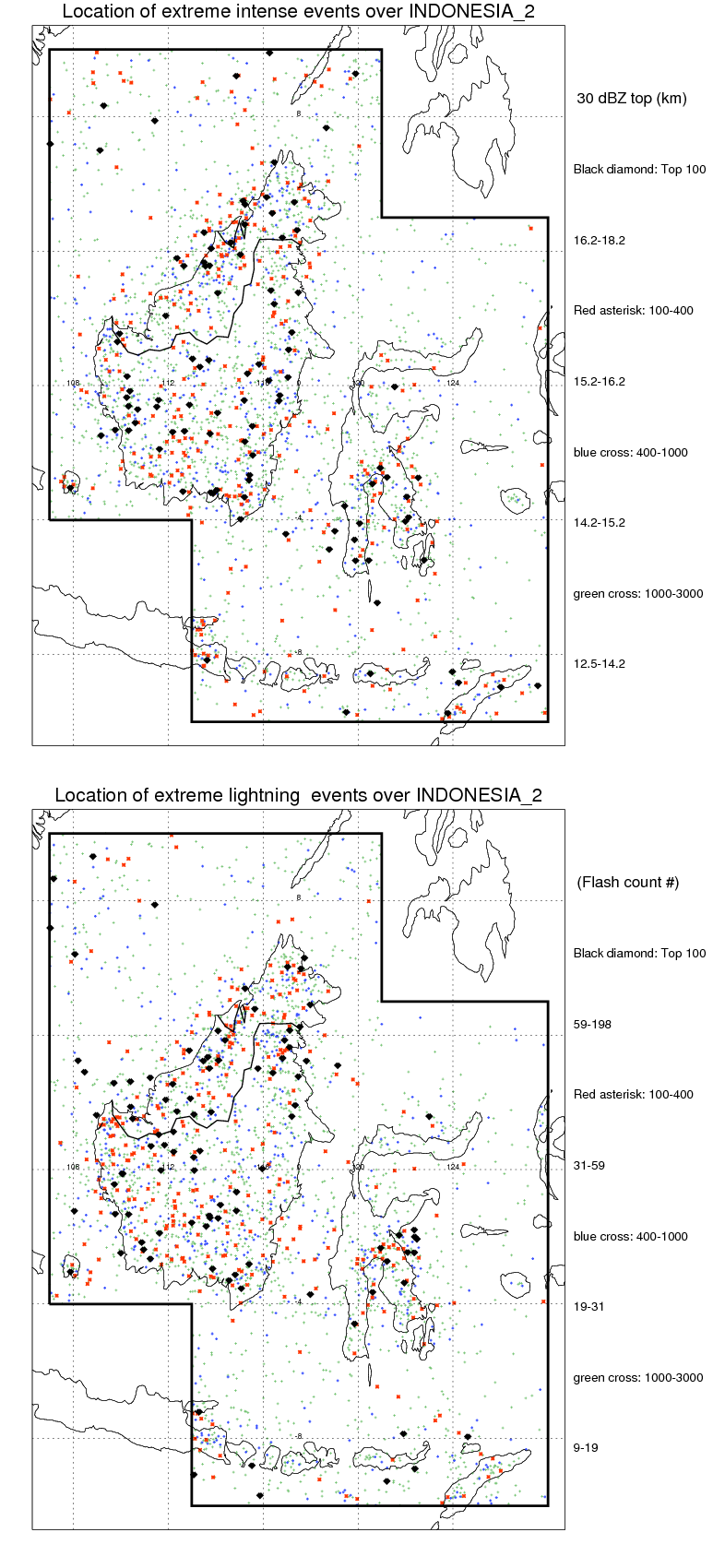 Following figure shows the location of the precipitation feautres categorized by the lightning rate and 30 dBZ echo top.