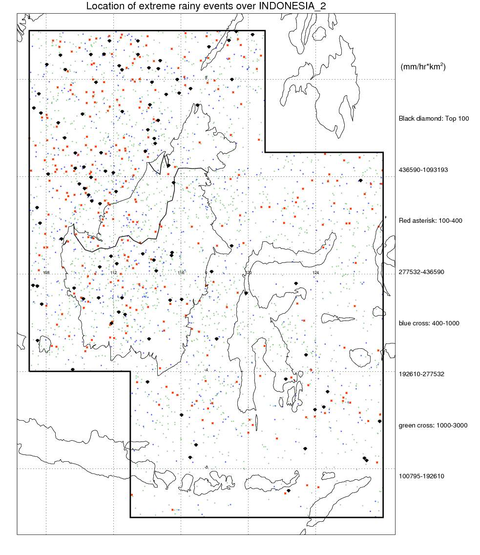 Following figure shows the location of the precipitation feautres categorized by the volumetric rainfall.