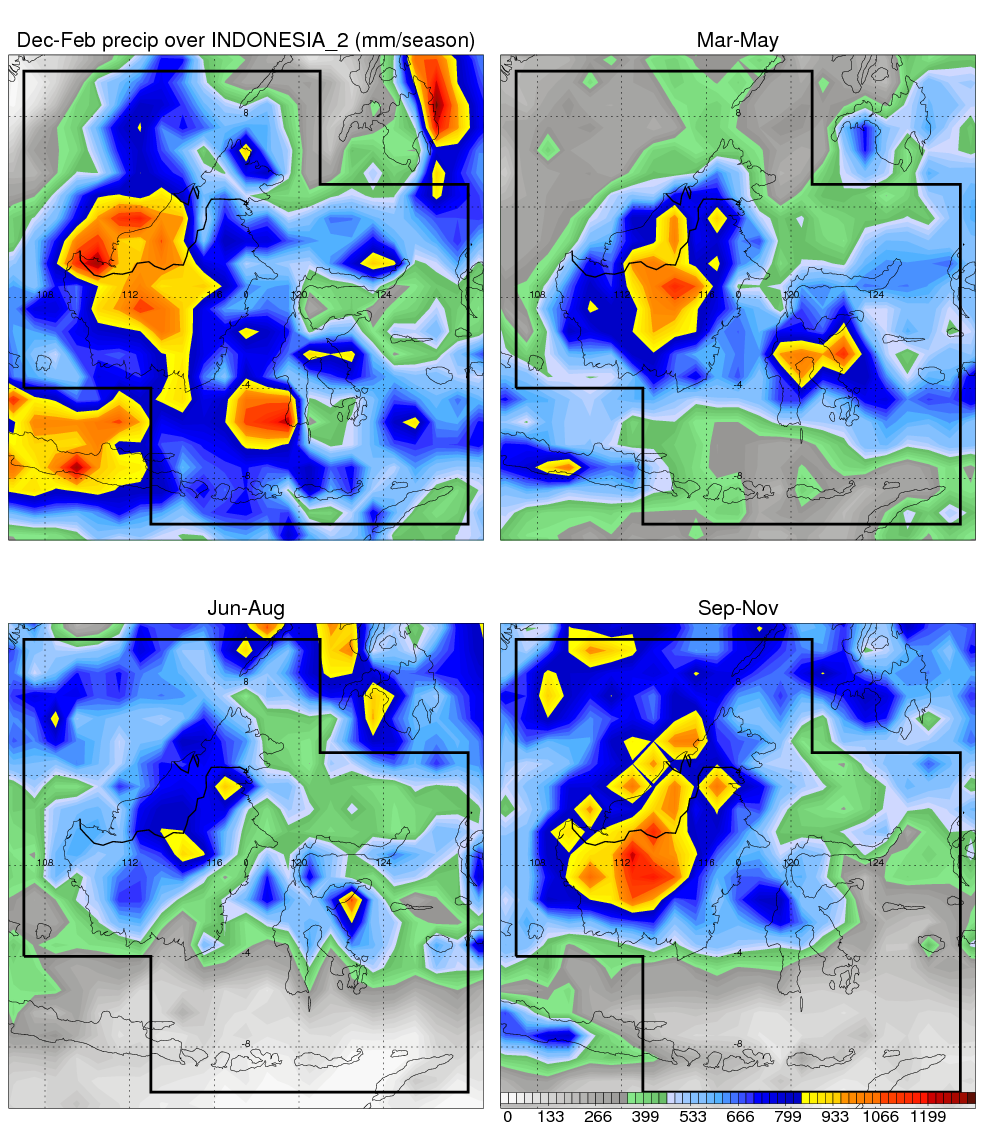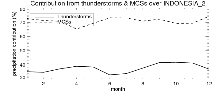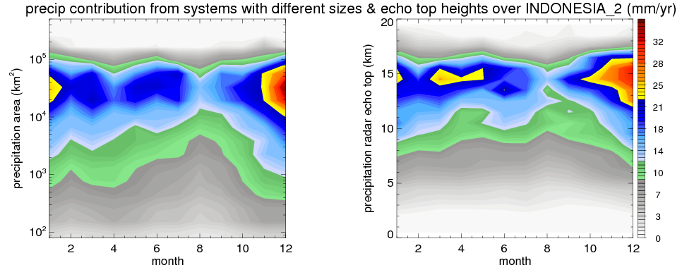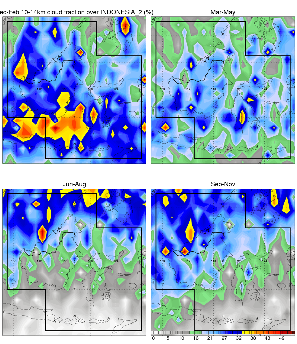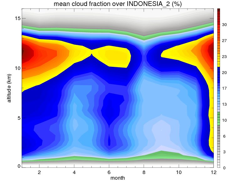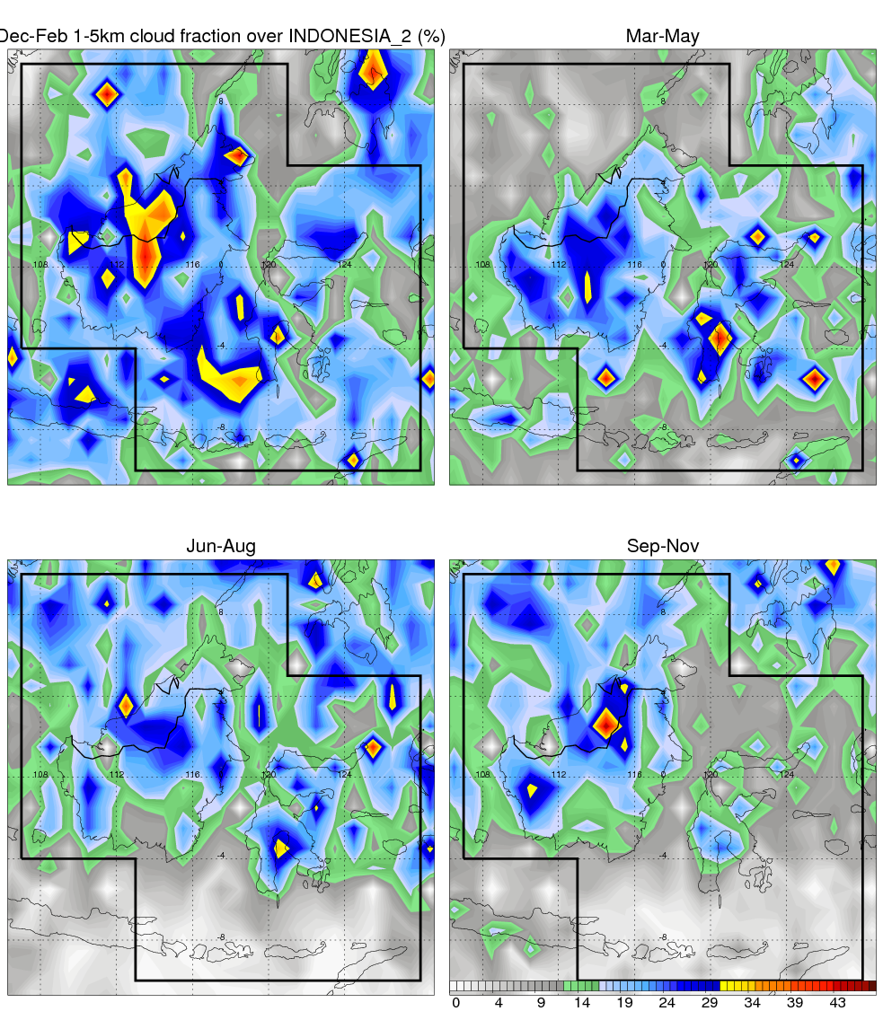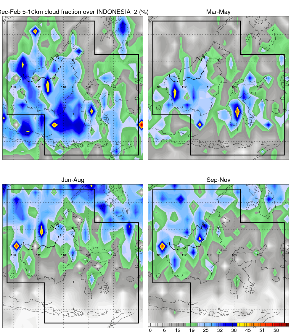 Over INDONESIA_2 , mean annual precipitation are estimated with 2123.4 (mm/year) from TRMM precipitation radar. (distribution of precipitation see here ) Total surface rainfall is brought by various precipitation systems. The seasonal variation of precipitation from systems with different sizes and heights are shown below: In total, thunderstorms (systems with detected lightning flashes) contribute 37 %, MCSs (Mesoscale convective systems with raining area > 2000 km^2) contribute 71 % of all precipitation. Seasonal variations of fraction of precipitation from thunderstorms and MCSs are shown below: The seasonal variation of geographical distribution of CloudSat cloud fraction over INDONESIA_2 is shown below: The seasonal variation of mean CloudSat level cloud fraction at different altitudes over INDONESIA_2 is shown below: |