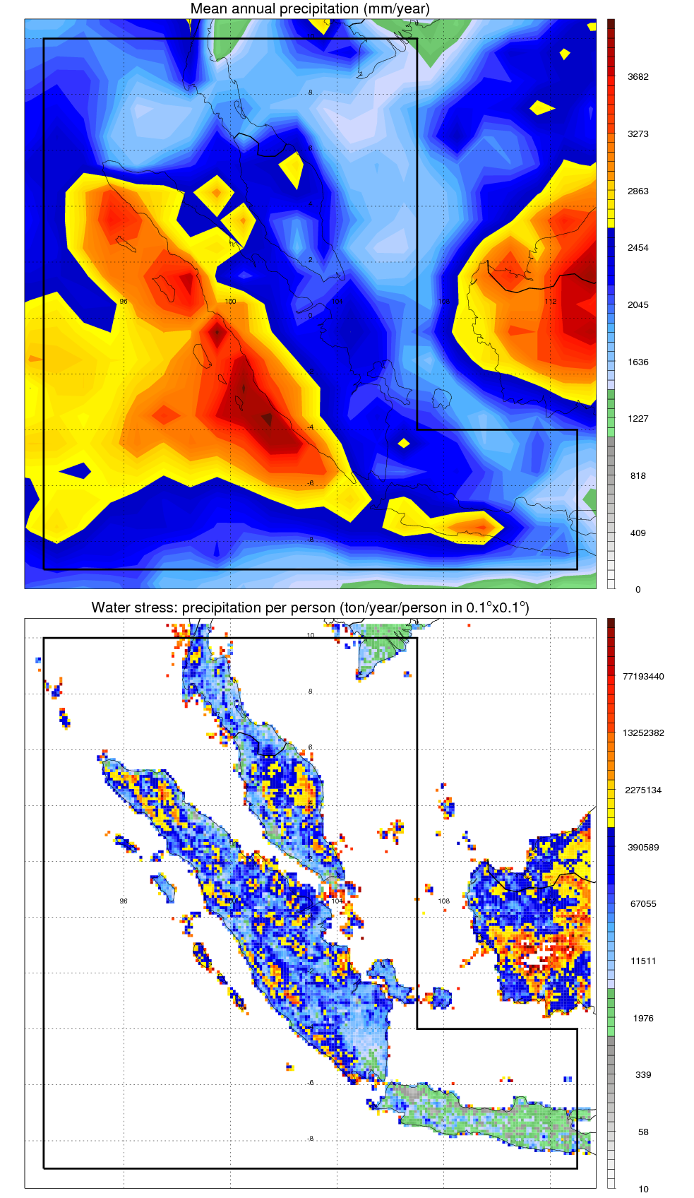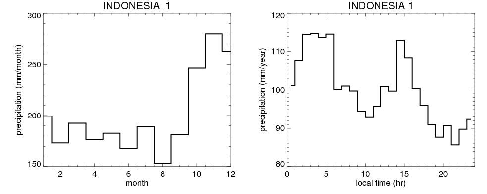 Over INDONESIA_1 , mean annual precipitation are estimated with 2405.8 (mm/year) from precipitation radar, and 1960.2 (mm/year) from microwave radiometer observations. (see high resolution precipitation product , NOTE: it may take long time to generate for large area) In total, thunderstorms (systems with detected lightning flashes) contribute 40 %, MCSs (Mesoscale convective systems with raining area > 2000 km^2) contribute 73 % of all precipitation. Seasonal and diurnal variations of rainfall over INDONESIA_1 are shown in following figure. You may check the details of rainfall contributions from precipitation systems with different sizes and intensities in various seasons and at different local times. |