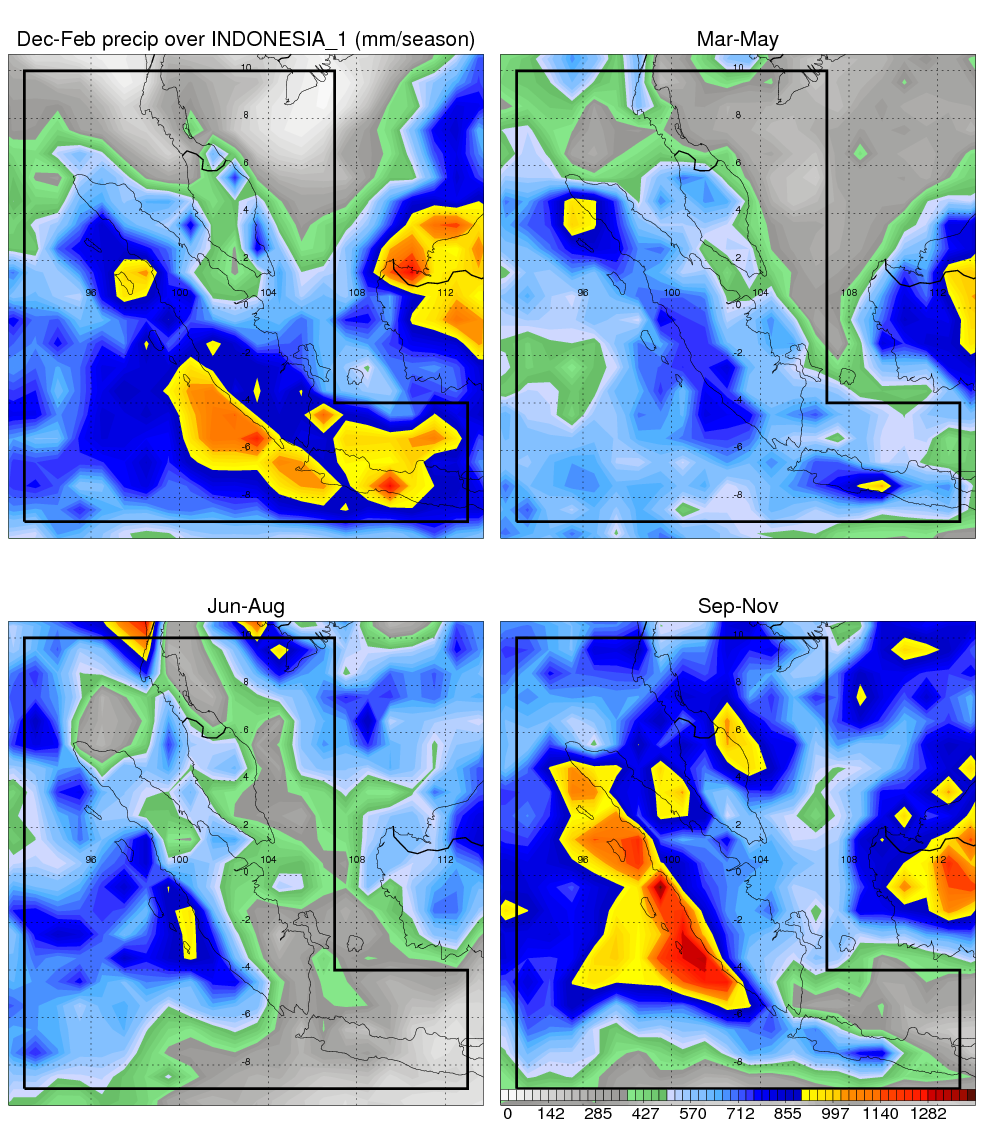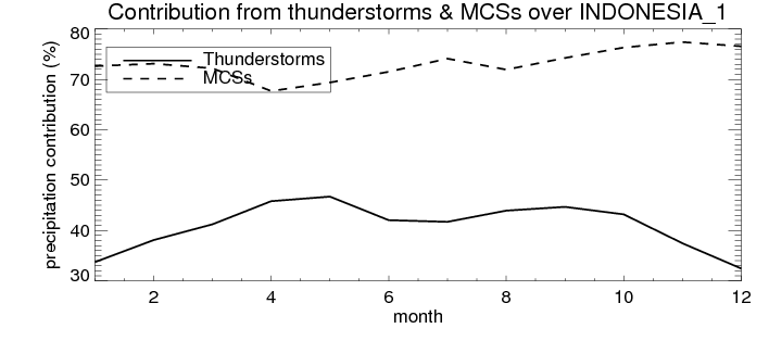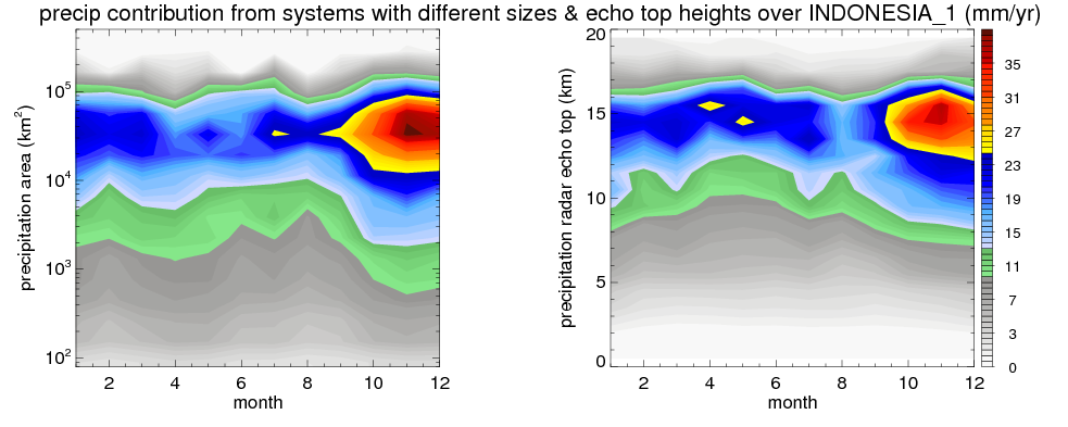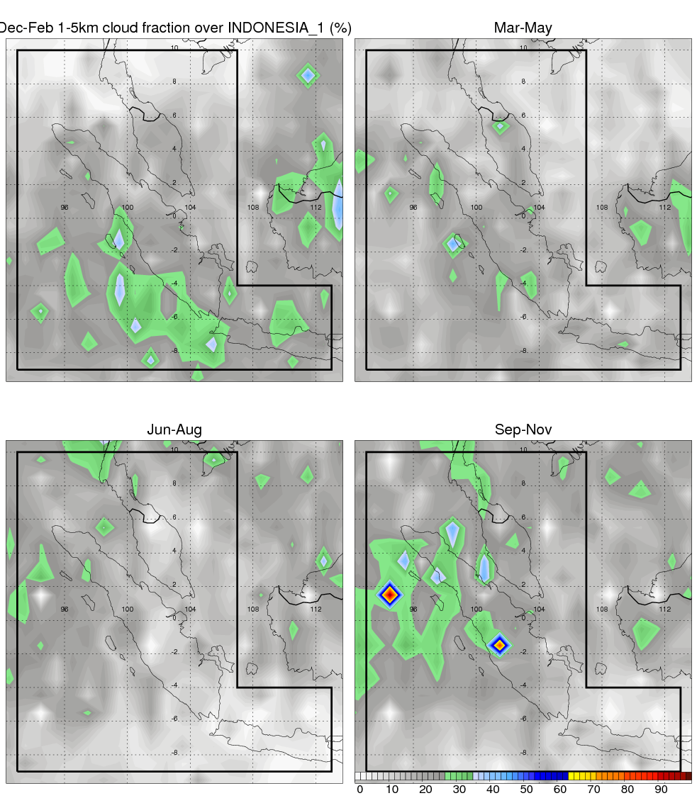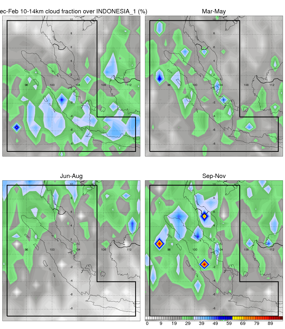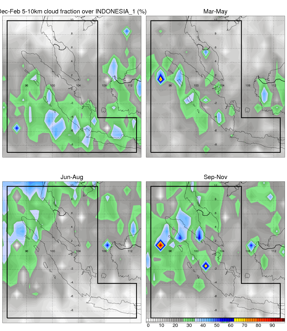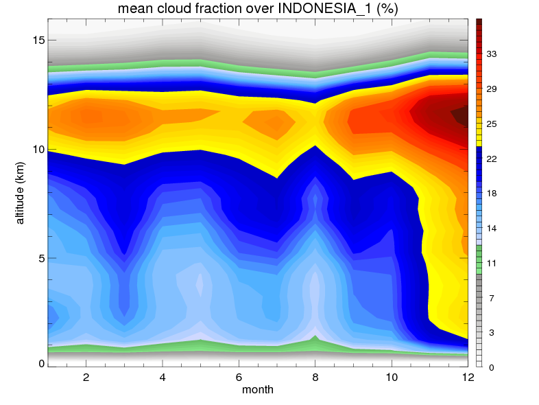 Over INDONESIA_1 , mean annual precipitation are estimated with 2405.8 (mm/year) from TRMM precipitation radar. (distribution of precipitation see here ) Total surface rainfall is brought by various precipitation systems. The seasonal variation of precipitation from systems with different sizes and heights are shown below: In total, thunderstorms (systems with detected lightning flashes) contribute 40 %, MCSs (Mesoscale convective systems with raining area > 2000 km^2) contribute 73 % of all precipitation. Seasonal variations of fraction of precipitation from thunderstorms and MCSs are shown below: The seasonal variation of geographical distribution of CloudSat cloud fraction over INDONESIA_1 is shown below: The seasonal variation of mean CloudSat level cloud fraction at different altitudes over INDONESIA_1 is shown below: |