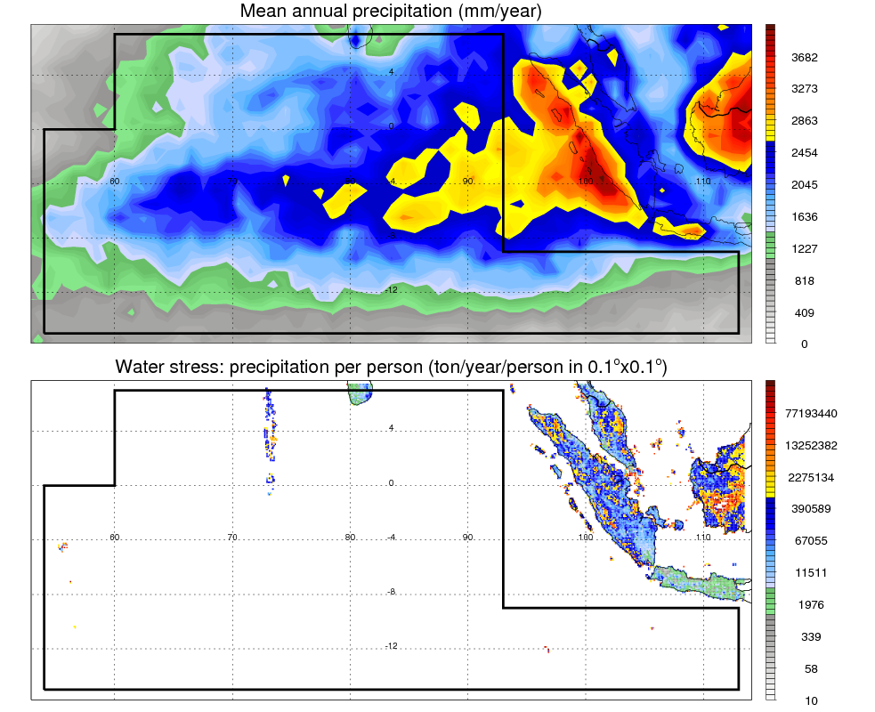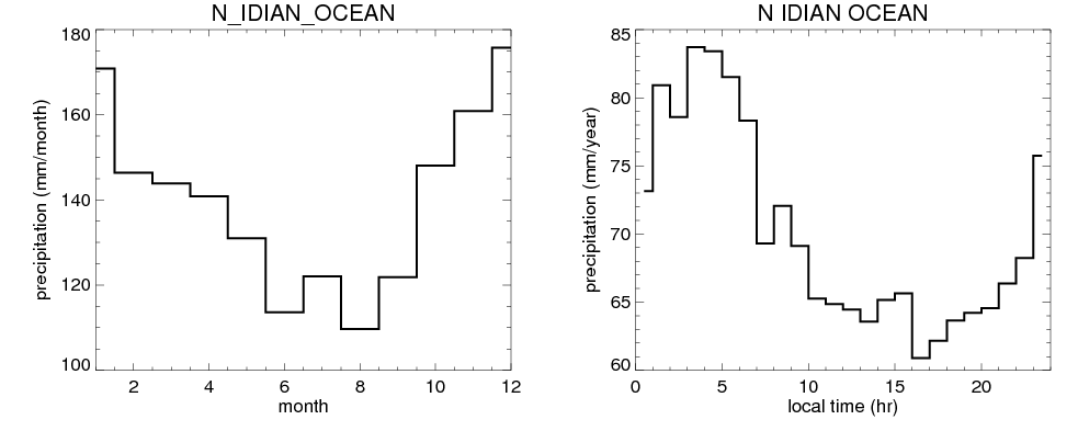 Over N_IDIAN_OCEAN , mean annual precipitation are estimated with 1684.8 (mm/year) from precipitation radar, and 1647.3 (mm/year) from microwave radiometer observations. (see high resolution precipitation product , NOTE: it may take long time to generate for large area) In total, thunderstorms (systems with detected lightning flashes) contribute 11 %, MCSs (Mesoscale convective systems with raining area > 2000 km^2) contribute 66 % of all precipitation. Seasonal and diurnal variations of rainfall over N_IDIAN_OCEAN are shown in following figure. You may check the details of rainfall contributions from precipitation systems with different sizes and intensities in various seasons and at different local times. |