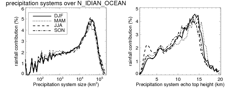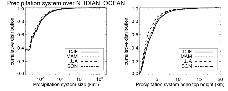 Over N_IDIAN_OCEAN , mean size of precipitation system about 236.4 (km^2) and mean maximum radar echo top height of these precipitation systems is about 3.9 km. Following figure shows the cumulative distribution of the sizes and depths of the precipitation systems in different seasons: Though usually there are more small systems, the larger systems would bring more total precipitation. |