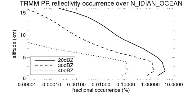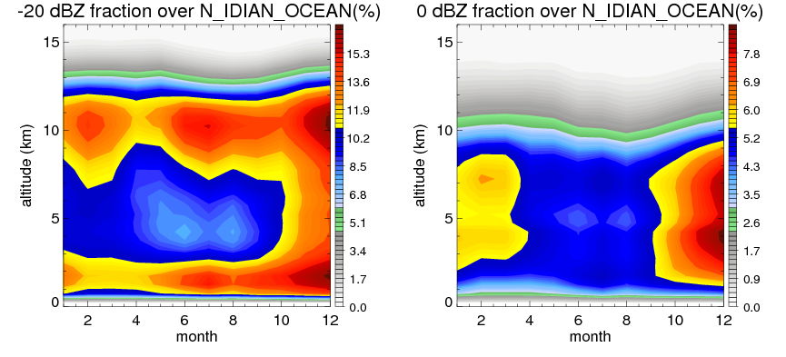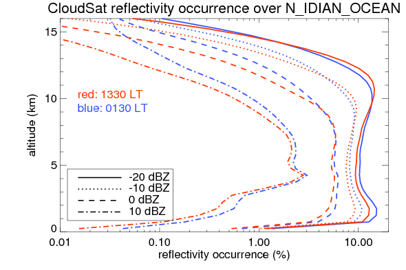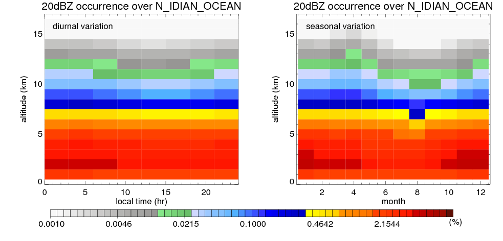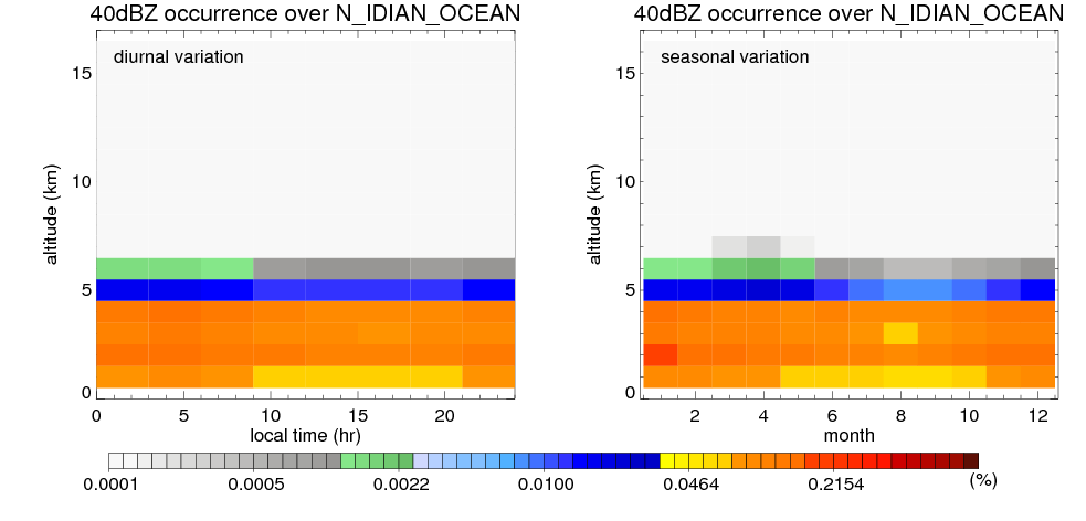 Here the precipitation means the precipitable hydrometeors (raindrops, snow flakes, graupel and hails) that detected by TRMM precipitation radar. Following figure shows the vertical profiles of 20, 30 and 40 dBZ fractional occurrence over N_IDIAN_OCEAN in different seasons. The seasonal and diurnal variations of precipitation (20 dBZ) fractional occurrence at different altitudes are shown below: The seasonal and diurnal variations of INTENSIVE precipitation (40 dBZ) fractional occurrence at different altitudes are shown below: Clouds are consisted of small hydrometeors that undetectable by TRMM precipitation radar (Ku band). CloudSat (W band radar) provides the much great details of clouds. Following figure shows the vertical structure of the thin and thick clouds over N_IDIAN_OCEAN. Note that high reflectivity at low levels are less frequent due to the attenuation. The seasonal variation of thin (-20 dBZ) and thick (0 dBZ) cloud over N_IDIAN_OCEAN are shown below: |