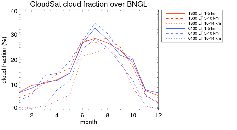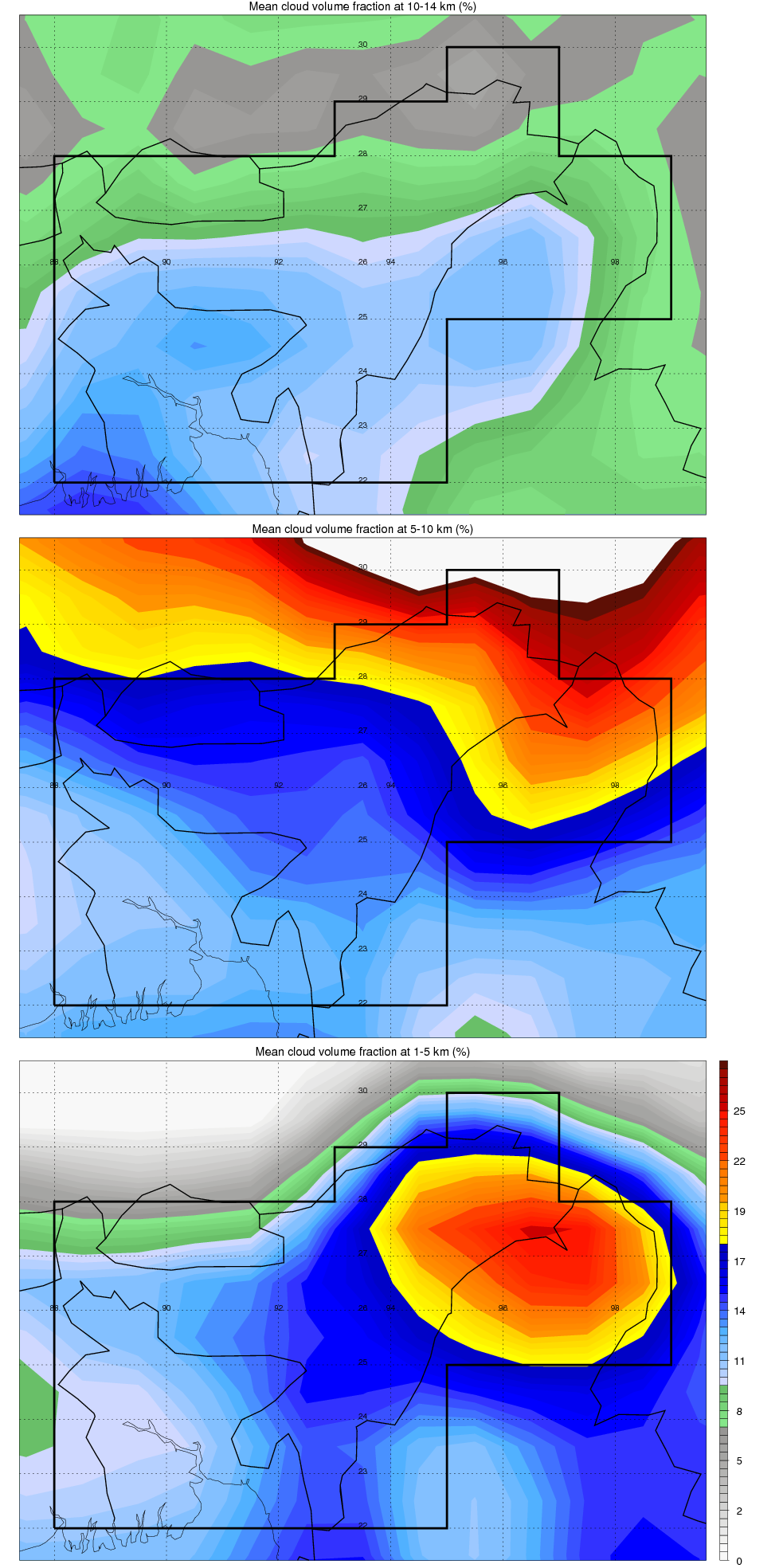 Over BNGL , mean high level (10-14 km) cloud volume fraction is about 10.4%. Mean mid level (5-10 km) cloud volume fraction is about 16.6%. Mean low level (1-5 km) cloud volume fraction is about 16.6%. Seasonal and day vs. night variations of high, mid and low level cloud fraction over BNGL are shown in following figure. You may check the details of cloud fraction in various seasons and at different local times. |