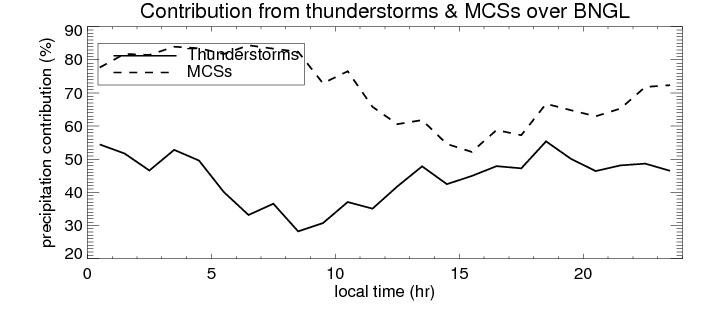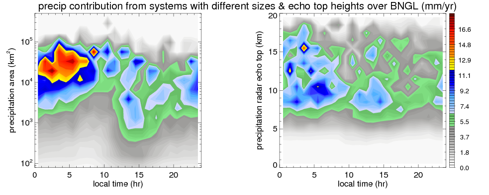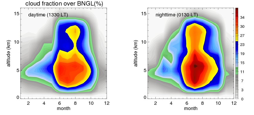 Many studies suggested that the diurnal variation of the precipitation is related to the life cycles of the precipitation systems, which is frequently driven by the surface sensible heating. Over BNGL, mean annual precipitation are estimated with 1826.4 (mm/year) from precipitation radar. Detailed diurnal variation of the precipitation at high resolution can be accessed here (NOTE: it may take long time to generate for a large area). The diurnal variation of precipitation from systems with different sizes and heights are shown below: In total, thunderstorms (systems with detected lightning flashes) contribute 44 %, MCSs (Mesoscale convective systems with raining area > 2000 km^2) contribute 72 % of all precipitation over BNGL. Diurnal variations of fraction of precipitation from thunderstorms and MCSs over BNGL are shown below: Certainly there is a strong diurnal variation of different types of clouds. Because CloudSat observes at 0130 and 1330 local time, here the daytime and night cloud fraction in different seasons are presented: |
