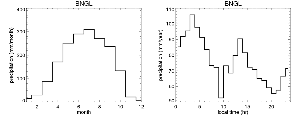 Over BNGL , mean annual precipitation are estimated with 1826.4 (mm/year) from precipitation radar, and 1578.2 (mm/year) from microwave radiometer observations. (see high resolution precipitation product , NOTE: it may take long time to generate for large area) In total, thunderstorms (systems with detected lightning flashes) contribute 44 %, MCSs (Mesoscale convective systems with raining area > 2000 km^2) contribute 72 % of all precipitation. Seasonal and diurnal variations of rainfall over BNGL are shown in following figure. You may check the details of rainfall contributions from precipitation systems with different sizes and intensities in various seasons and at different local times. |