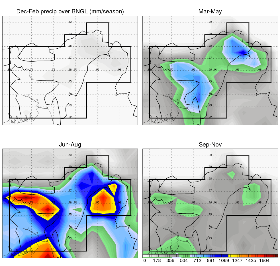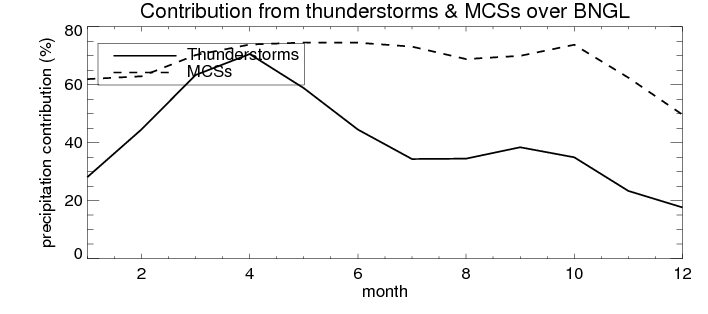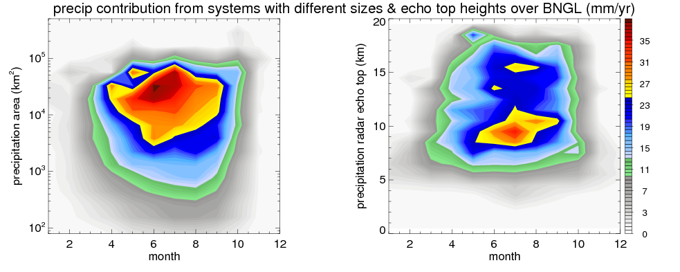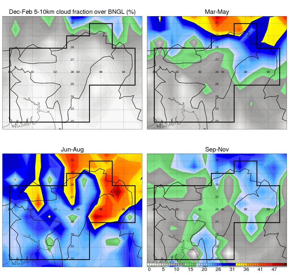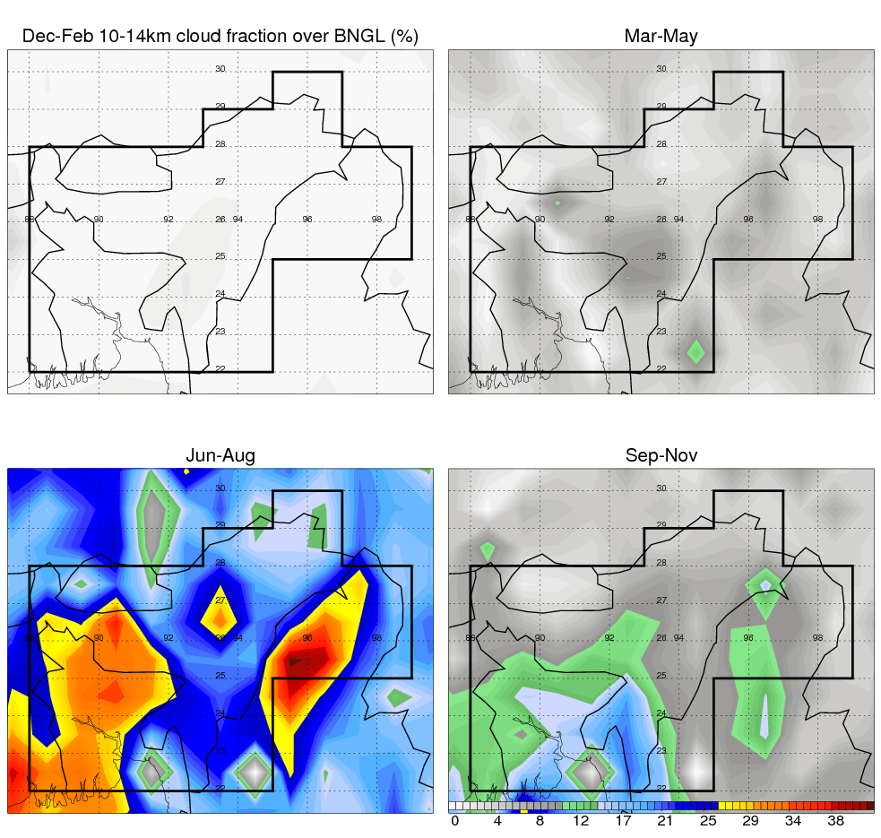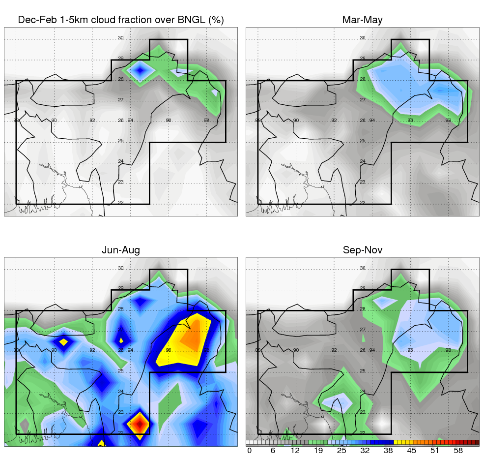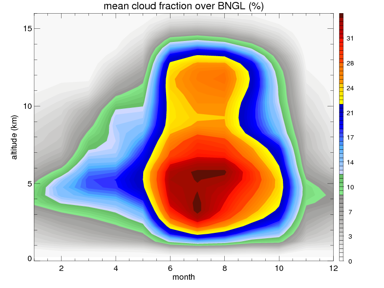 Over BNGL , mean annual precipitation are estimated with 1826.4 (mm/year) from TRMM precipitation radar. (distribution of precipitation see here ) Total surface rainfall is brought by various precipitation systems. The seasonal variation of precipitation from systems with different sizes and heights are shown below: In total, thunderstorms (systems with detected lightning flashes) contribute 44 %, MCSs (Mesoscale convective systems with raining area > 2000 km^2) contribute 72 % of all precipitation. Seasonal variations of fraction of precipitation from thunderstorms and MCSs are shown below: The seasonal variation of geographical distribution of CloudSat cloud fraction over BNGL is shown below: The seasonal variation of mean CloudSat level cloud fraction at different altitudes over BNGL is shown below: |