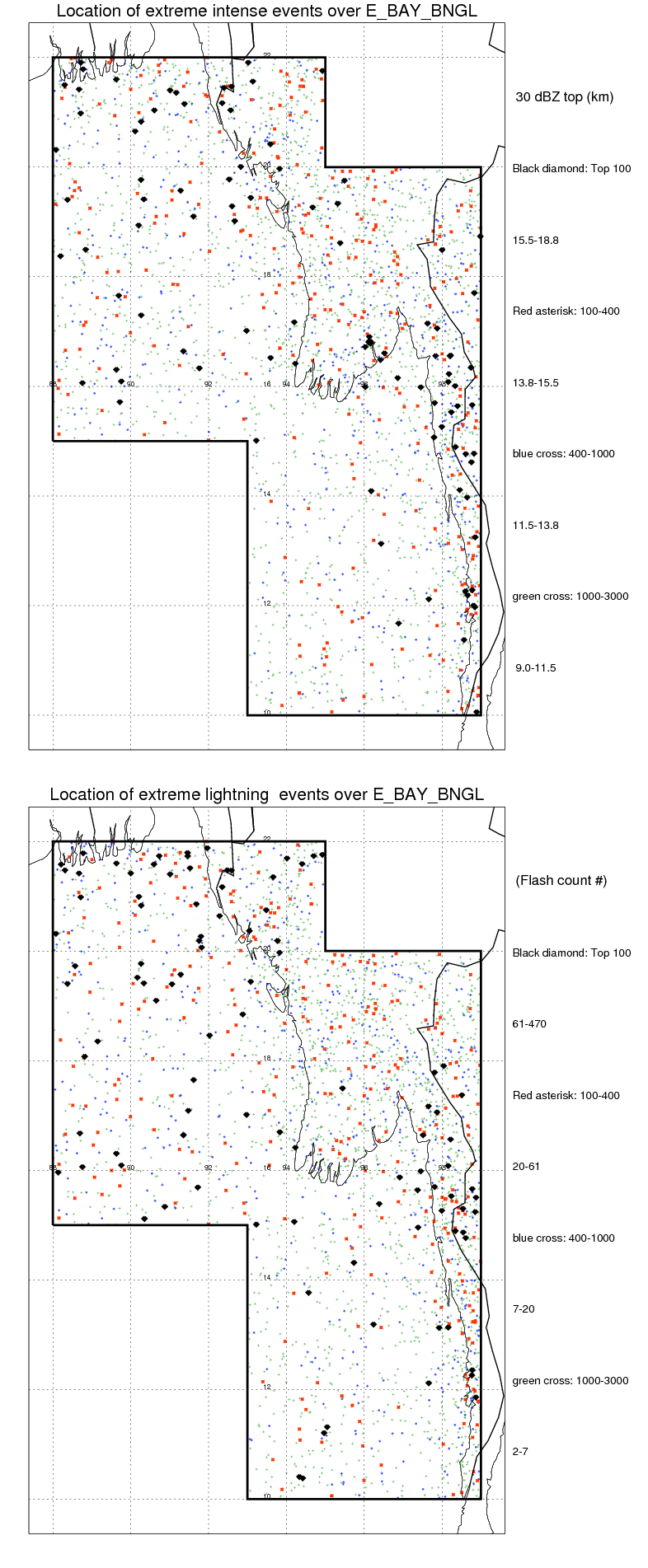 Following figure shows the location of the precipitation feautres categorized by the lightning rate and 30 dBZ echo top.