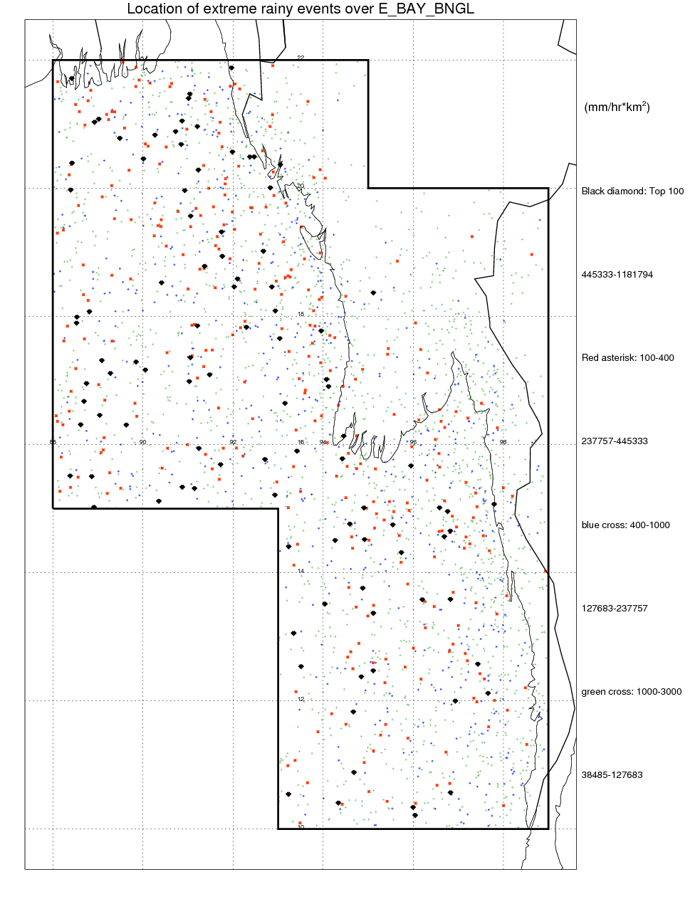 Following figure shows the location of the precipitation feautres categorized by the volumetric rainfall.