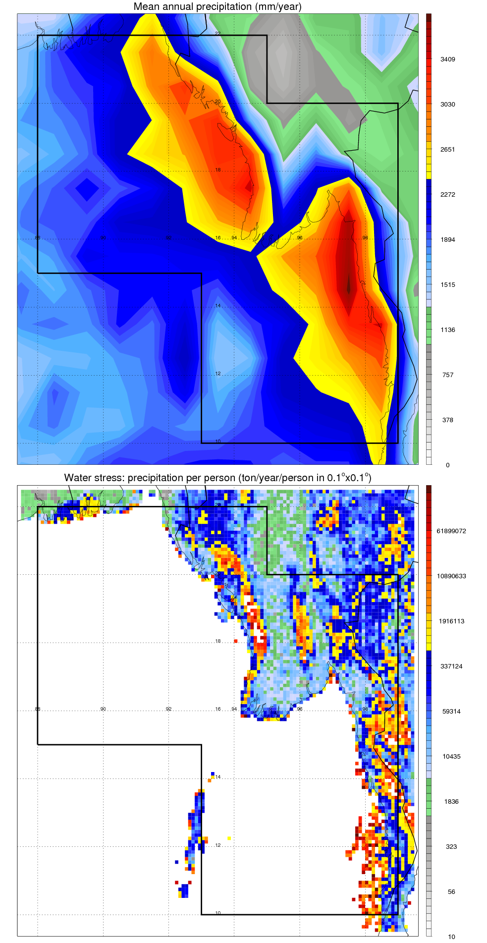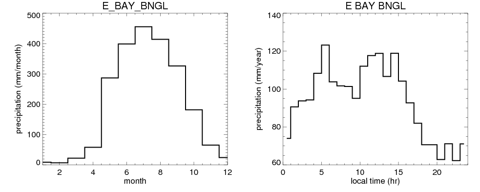 Over E_BAY_BNGL , mean annual precipitation are estimated with 2247.5 (mm/year) from precipitation radar, and 1788.7 (mm/year) from microwave radiometer observations. (see high resolution precipitation product , NOTE: it may take long time to generate for large area) In total, thunderstorms (systems with detected lightning flashes) contribute 37 %, MCSs (Mesoscale convective systems with raining area > 2000 km^2) contribute 80 % of all precipitation. Seasonal and diurnal variations of rainfall over E_BAY_BNGL are shown in following figure. You may check the details of rainfall contributions from precipitation systems with different sizes and intensities in various seasons and at different local times. |