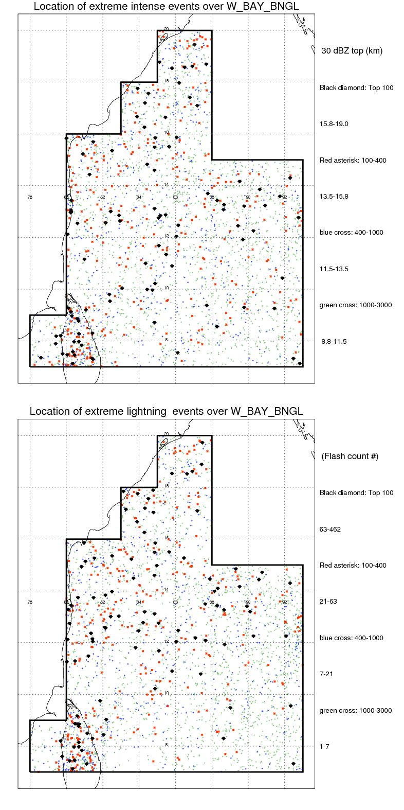 Following figure shows the location of the precipitation feautres categorized by the lightning rate and 30 dBZ echo top.