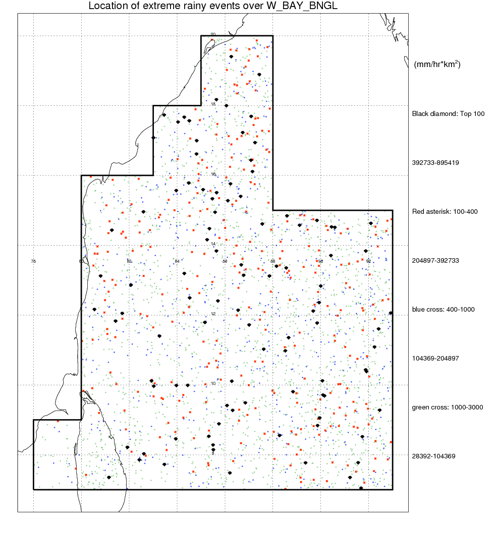 Following figure shows the location of the precipitation feautres categorized by the volumetric rainfall.