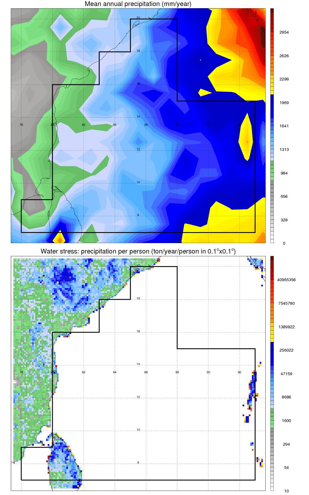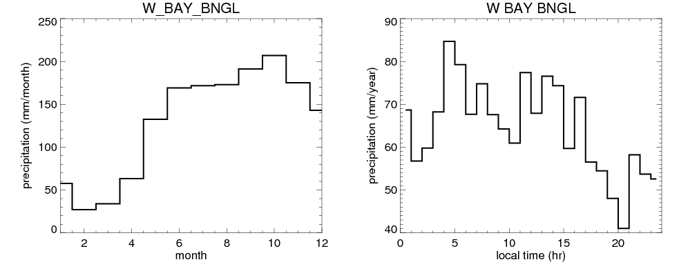 Over W_BAY_BNGL , mean annual precipitation are estimated with 1544.5 (mm/year) from precipitation radar, and 1379.5 (mm/year) from microwave radiometer observations. (see high resolution precipitation product , NOTE: it may take long time to generate for large area) In total, thunderstorms (systems with detected lightning flashes) contribute 40 %, MCSs (Mesoscale convective systems with raining area > 2000 km^2) contribute 75 % of all precipitation. Seasonal and diurnal variations of rainfall over W_BAY_BNGL are shown in following figure. You may check the details of rainfall contributions from precipitation systems with different sizes and intensities in various seasons and at different local times. |