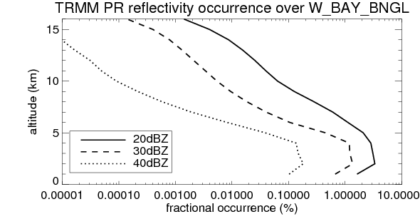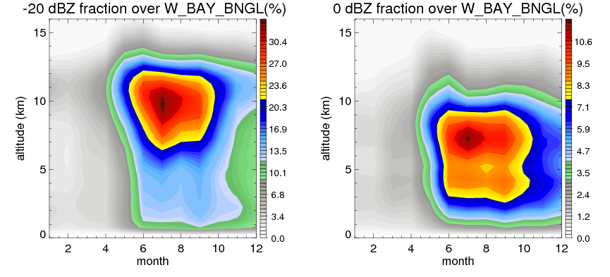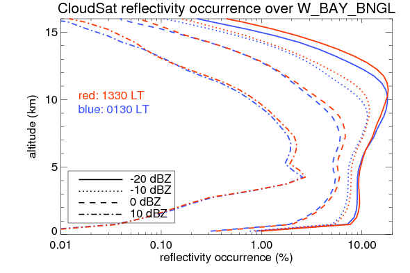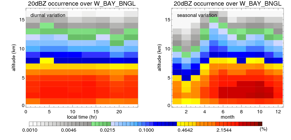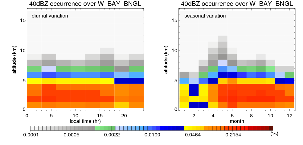 Here the precipitation means the precipitable hydrometeors (raindrops, snow flakes, graupel and hails) that detected by TRMM precipitation radar. Following figure shows the vertical profiles of 20, 30 and 40 dBZ fractional occurrence over W_BAY_BNGL in different seasons. The seasonal and diurnal variations of precipitation (20 dBZ) fractional occurrence at different altitudes are shown below: The seasonal and diurnal variations of INTENSIVE precipitation (40 dBZ) fractional occurrence at different altitudes are shown below: Clouds are consisted of small hydrometeors that undetectable by TRMM precipitation radar (Ku band). CloudSat (W band radar) provides the much great details of clouds. Following figure shows the vertical structure of the thin and thick clouds over W_BAY_BNGL. Note that high reflectivity at low levels are less frequent due to the attenuation. The seasonal variation of thin (-20 dBZ) and thick (0 dBZ) cloud over W_BAY_BNGL are shown below: |