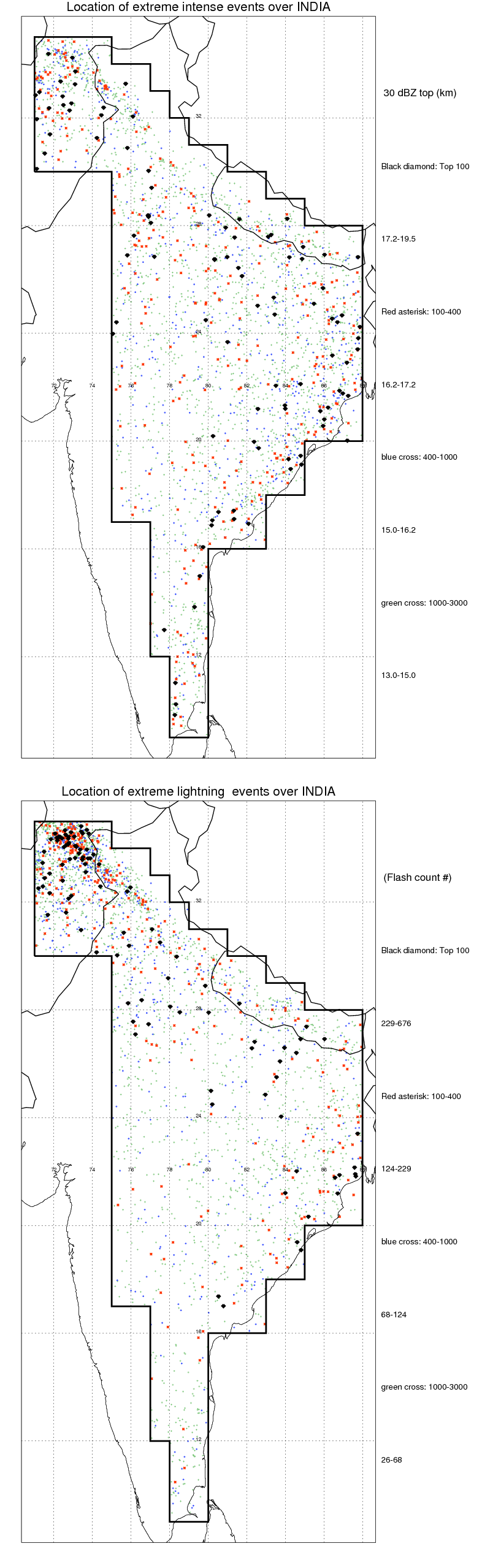 Following figure shows the location of the precipitation feautres categorized by the lightning rate and 30 dBZ echo top.