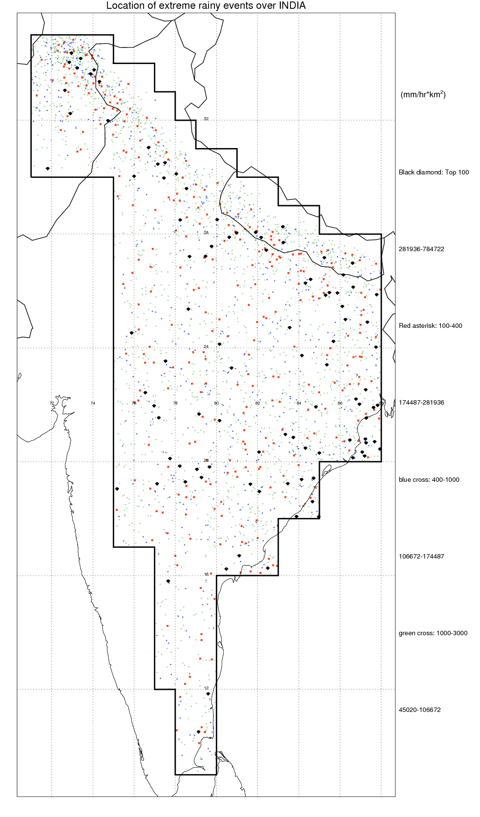Following figure shows the location of the precipitation feautres categorized by the volumetric rainfall.