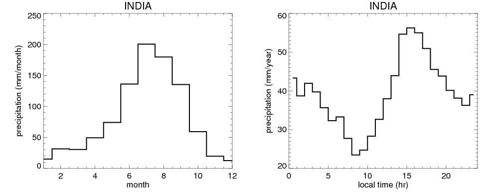 Over INDIA , mean annual precipitation are estimated with 943.6 (mm/year) from precipitation radar, and 1005.3 (mm/year) from microwave radiometer observations. (see high resolution precipitation product , NOTE: it may take long time to generate for large area) In total, thunderstorms (systems with detected lightning flashes) contribute 58 %, MCSs (Mesoscale convective systems with raining area > 2000 km^2) contribute 69 % of all precipitation. Seasonal and diurnal variations of rainfall over INDIA are shown in following figure. You may check the details of rainfall contributions from precipitation systems with different sizes and intensities in various seasons and at different local times. |