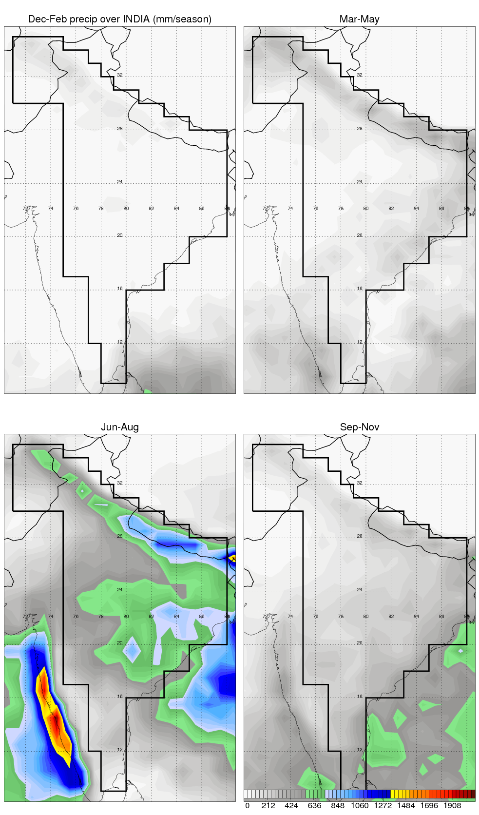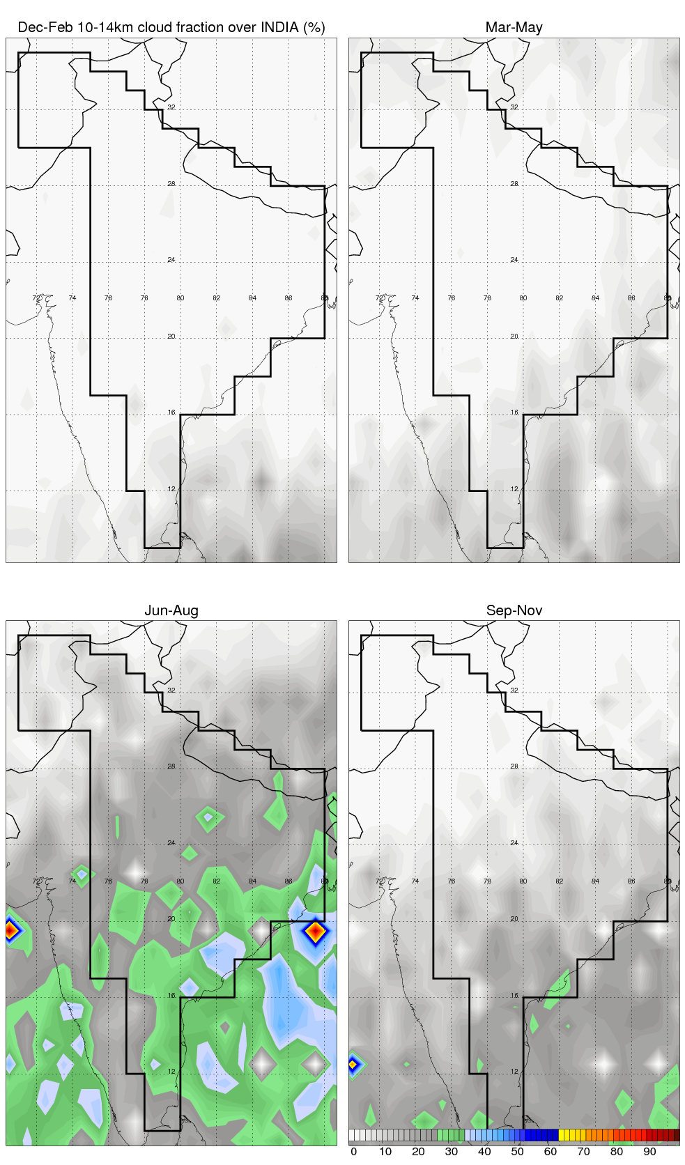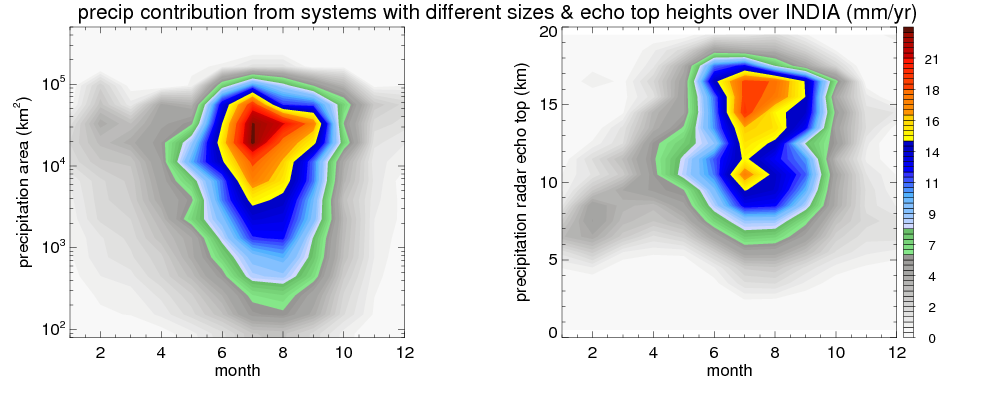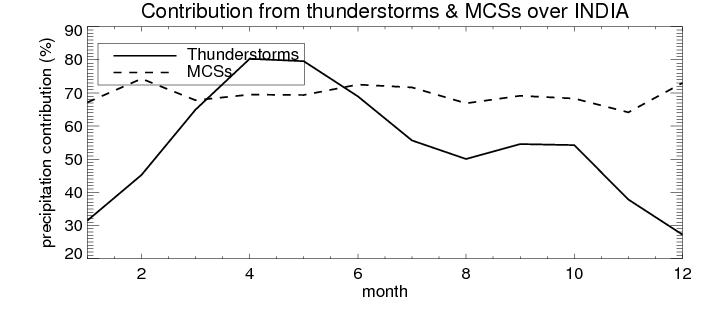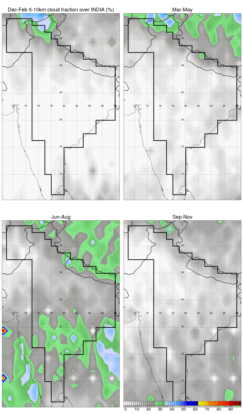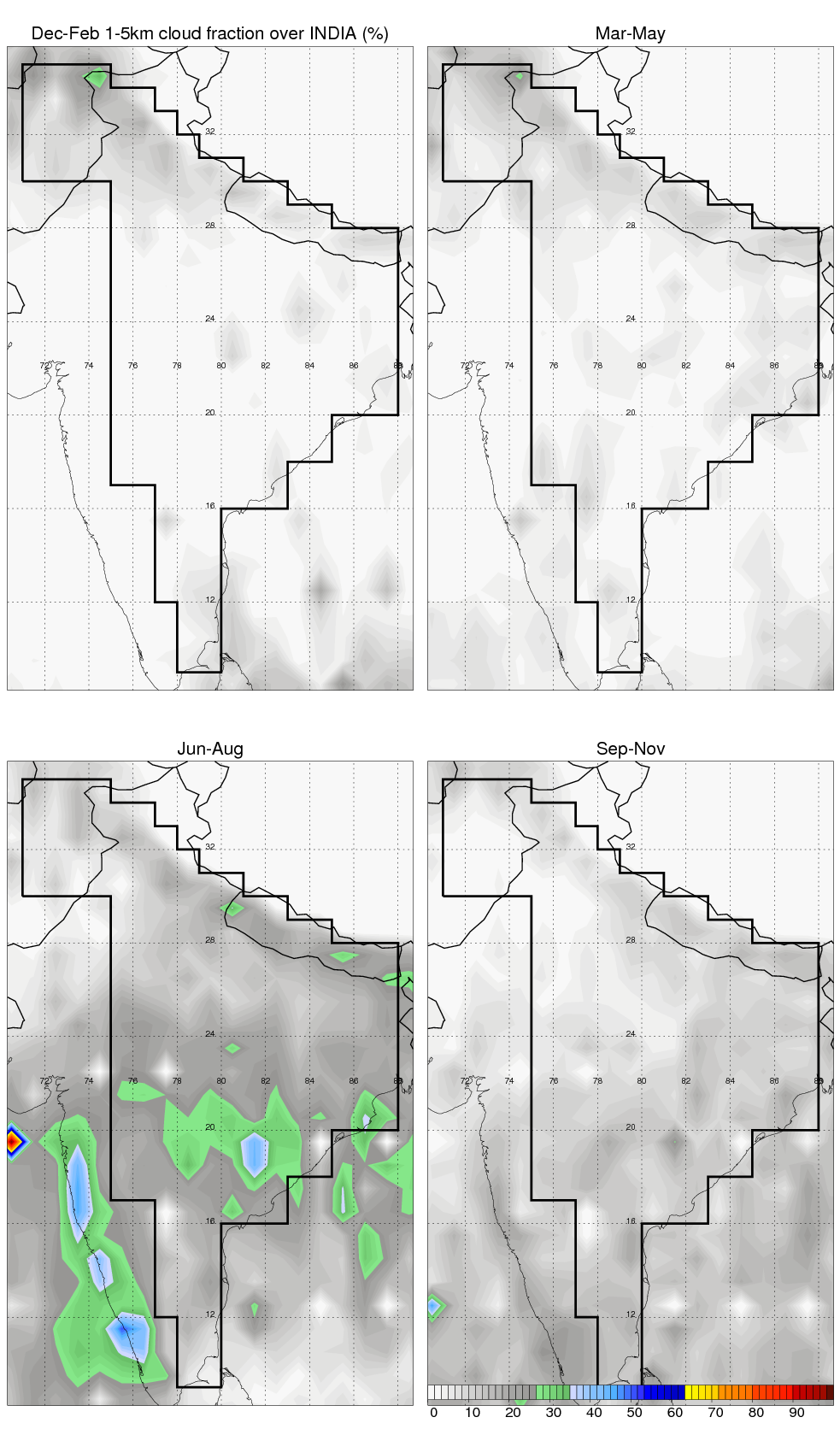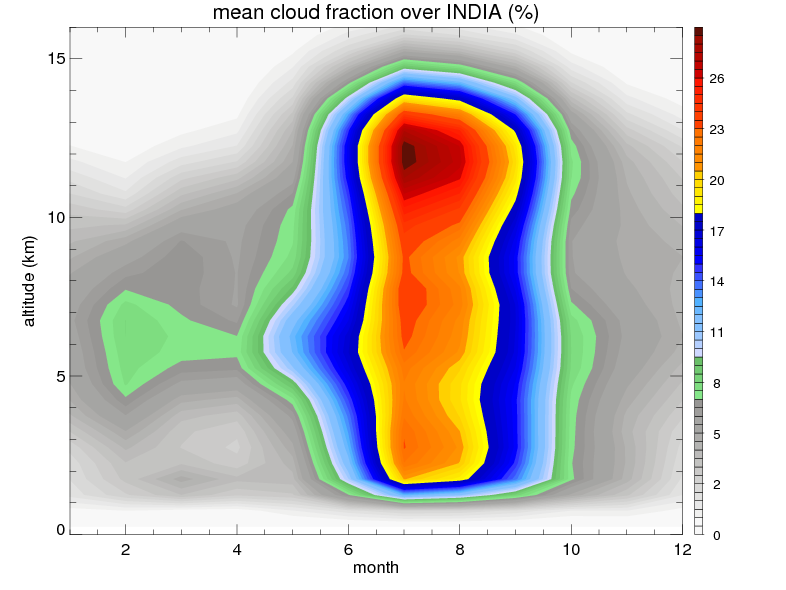 Over INDIA , mean annual precipitation are estimated with 943.6 (mm/year) from TRMM precipitation radar. (distribution of precipitation see here ) Total surface rainfall is brought by various precipitation systems. The seasonal variation of precipitation from systems with different sizes and heights are shown below: In total, thunderstorms (systems with detected lightning flashes) contribute 58 %, MCSs (Mesoscale convective systems with raining area > 2000 km^2) contribute 69 % of all precipitation. Seasonal variations of fraction of precipitation from thunderstorms and MCSs are shown below: The seasonal variation of geographical distribution of CloudSat cloud fraction over INDIA is shown below: The seasonal variation of mean CloudSat level cloud fraction at different altitudes over INDIA is shown below: |