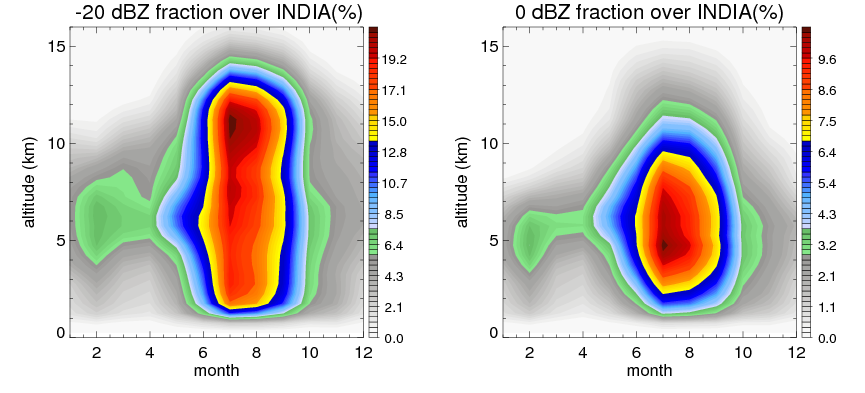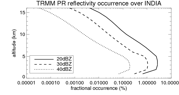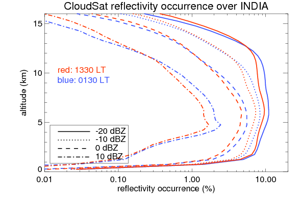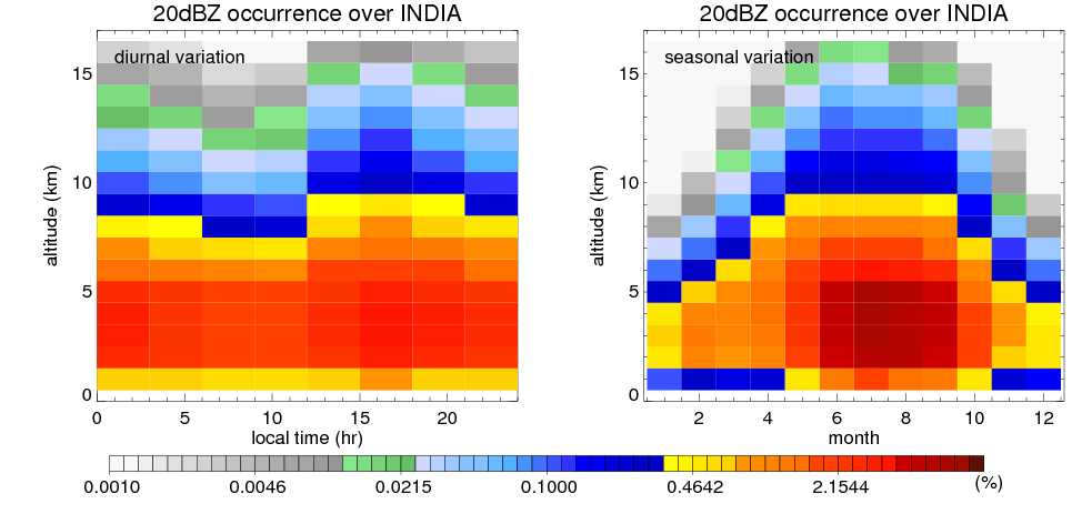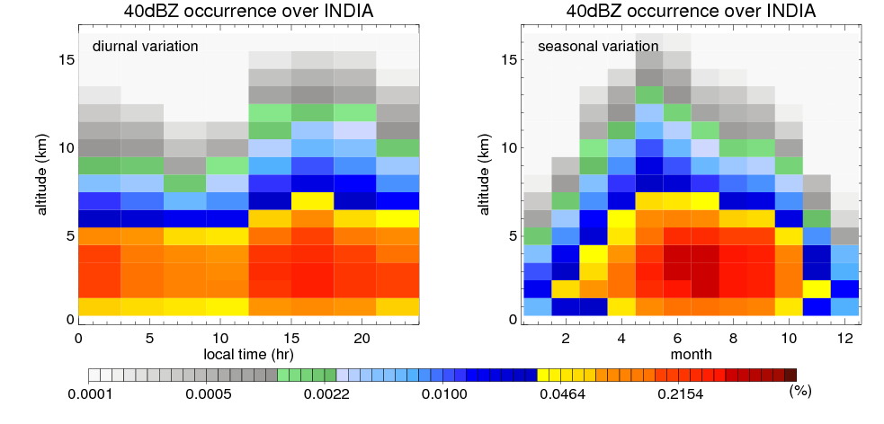 Here the precipitation means the precipitable hydrometeors (raindrops, snow flakes, graupel and hails) that detected by TRMM precipitation radar. Following figure shows the vertical profiles of 20, 30 and 40 dBZ fractional occurrence over INDIA in different seasons. The seasonal and diurnal variations of precipitation (20 dBZ) fractional occurrence at different altitudes are shown below: The seasonal and diurnal variations of INTENSIVE precipitation (40 dBZ) fractional occurrence at different altitudes are shown below: Clouds are consisted of small hydrometeors that undetectable by TRMM precipitation radar (Ku band). CloudSat (W band radar) provides the much great details of clouds. Following figure shows the vertical structure of the thin and thick clouds over INDIA. Note that high reflectivity at low levels are less frequent due to the attenuation. The seasonal variation of thin (-20 dBZ) and thick (0 dBZ) cloud over INDIA are shown below: |