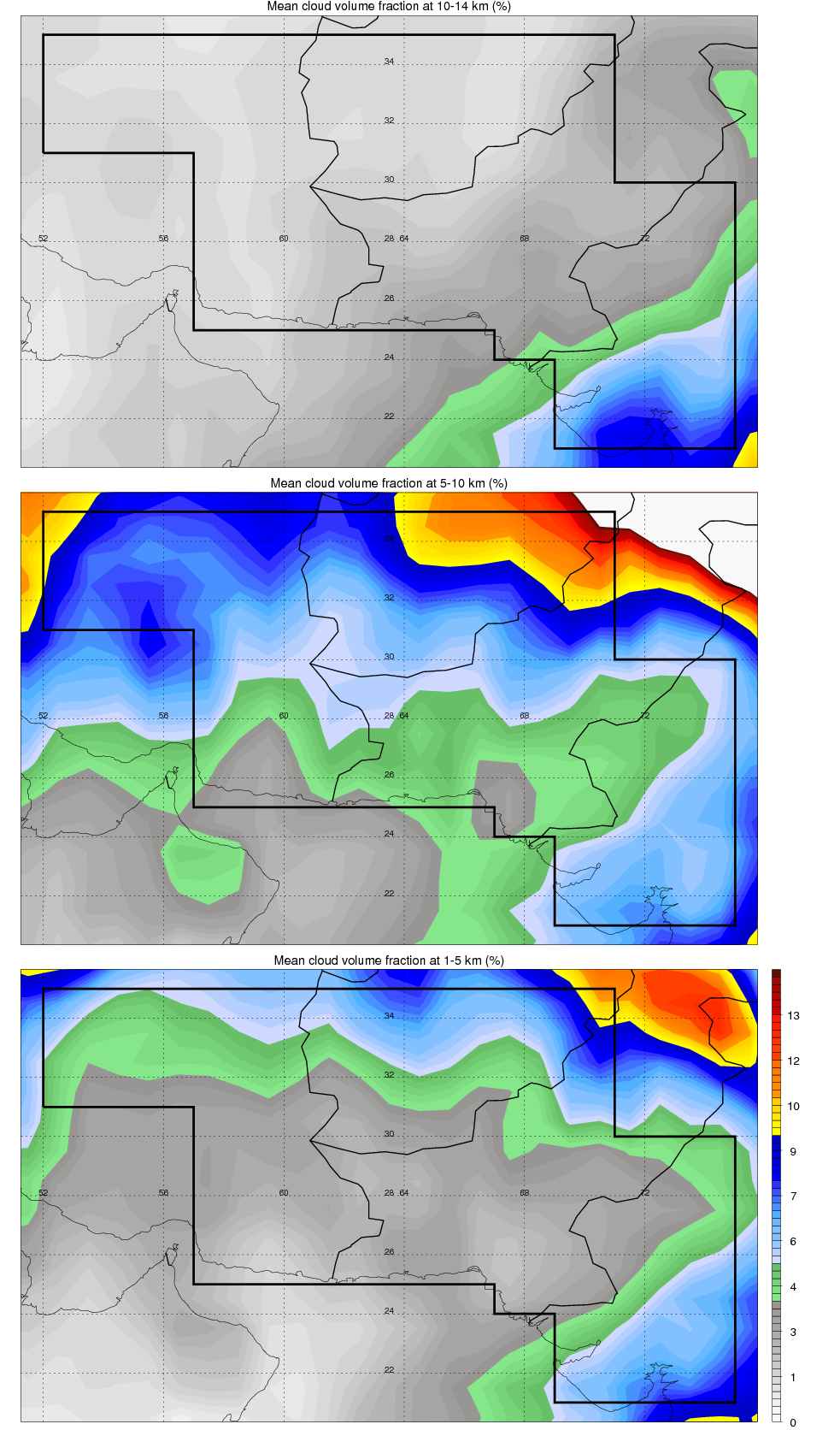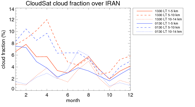Over IRAN , mean high level (10-14 km) cloud volume fraction is about 2.4%. Mean mid level (5-10 km) cloud volume fraction is about 6.3%. Mean low level (1-5 km) cloud volume fraction is about 4.3%. Seasonal and day vs. night variations of high, mid and low level cloud fraction over IRAN are shown in following figure. You may check the details of cloud fraction in various seasons and at different local times. |