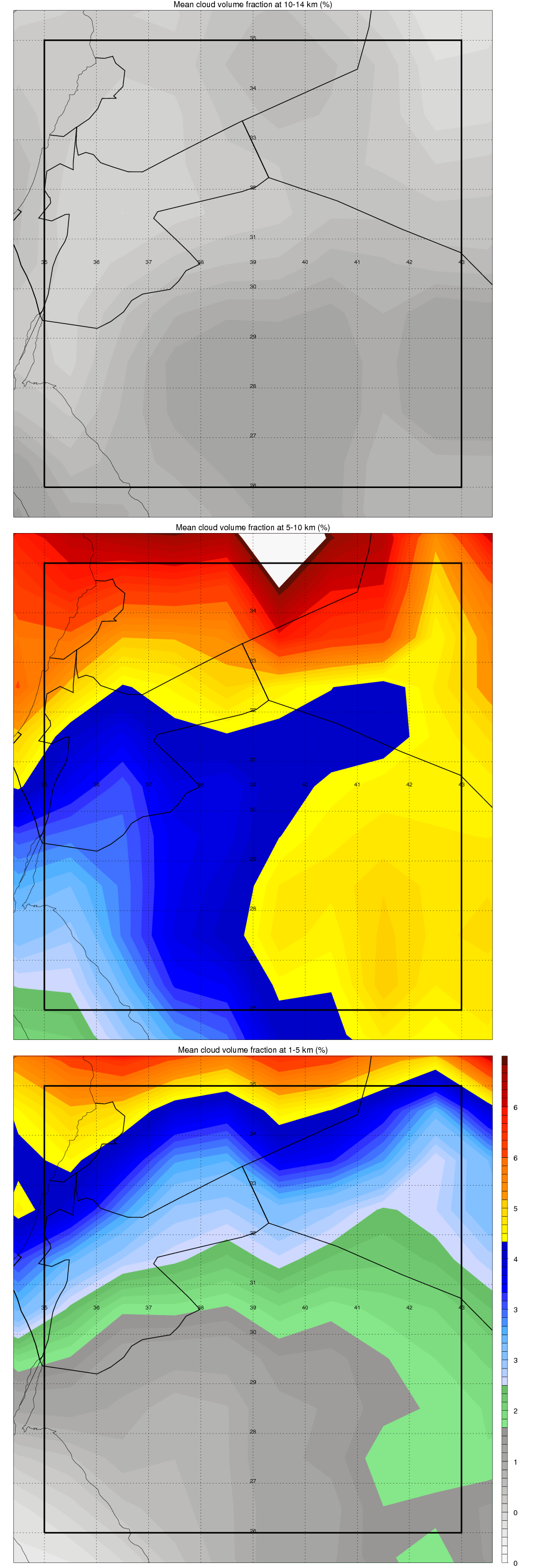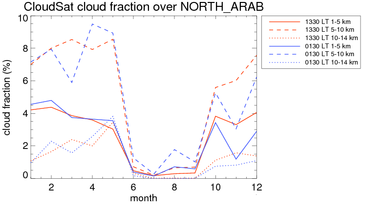 Over NORTH_ARAB , mean high level (10-14 km) cloud volume fraction is about 1.2%. Mean mid level (5-10 km) cloud volume fraction is about 4.8%. Mean low level (1-5 km) cloud volume fraction is about 2.5%. Seasonal and day vs. night variations of high, mid and low level cloud fraction over NORTH_ARAB are shown in following figure. You may check the details of cloud fraction in various seasons and at different local times. |