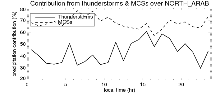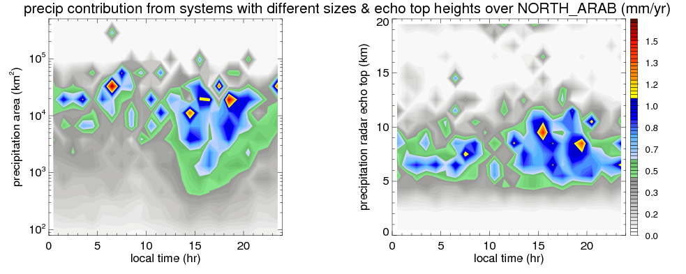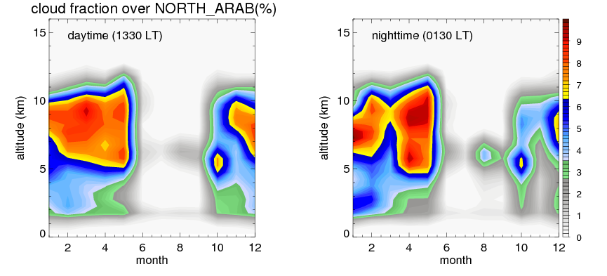 Many studies suggested that the diurnal variation of the precipitation is related to the life cycles of the precipitation systems, which is frequently driven by the surface sensible heating. Over NORTH_ARAB, mean annual precipitation are estimated with 126.2 (mm/year) from precipitation radar. Detailed diurnal variation of the precipitation at high resolution can be accessed here (NOTE: it may take long time to generate for a large area). The diurnal variation of precipitation from systems with different sizes and heights are shown below: In total, thunderstorms (systems with detected lightning flashes) contribute 44 %, MCSs (Mesoscale convective systems with raining area > 2000 km^2) contribute 67 % of all precipitation over NORTH_ARAB. Diurnal variations of fraction of precipitation from thunderstorms and MCSs over NORTH_ARAB are shown below: Certainly there is a strong diurnal variation of different types of clouds. Because CloudSat observes at 0130 and 1330 local time, here the daytime and night cloud fraction in different seasons are presented: |