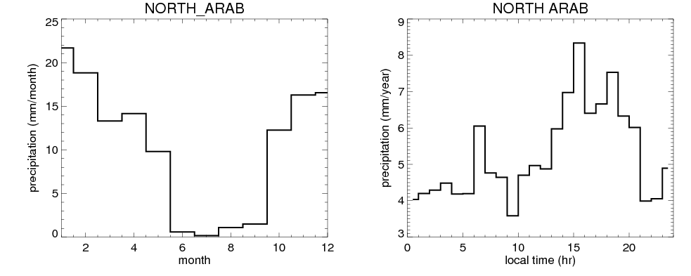 Over NORTH_ARAB , mean annual precipitation are estimated with 126.2 (mm/year) from precipitation radar, and 31.6 (mm/year) from microwave radiometer observations. (see high resolution precipitation product , NOTE: it may take long time to generate for large area) In total, thunderstorms (systems with detected lightning flashes) contribute 44 %, MCSs (Mesoscale convective systems with raining area > 2000 km^2) contribute 67 % of all precipitation. Seasonal and diurnal variations of rainfall over NORTH_ARAB are shown in following figure. You may check the details of rainfall contributions from precipitation systems with different sizes and intensities in various seasons and at different local times. |