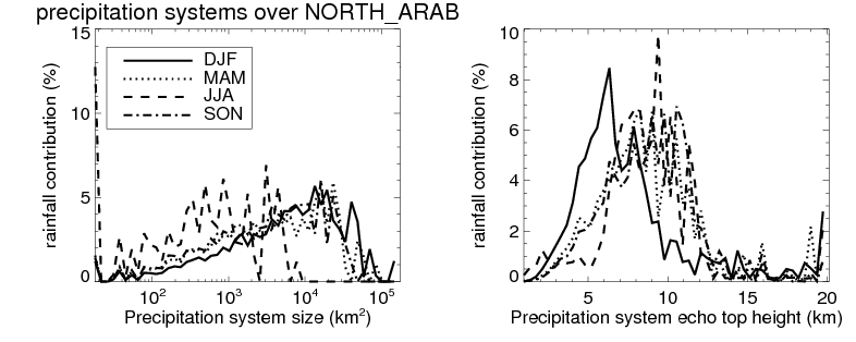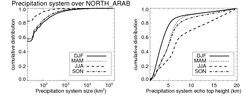 Over NORTH_ARAB , mean size of precipitation system about 211.4 (km^2) and mean maximum radar echo top height of these precipitation systems is about 5.9 km. Following figure shows the cumulative distribution of the sizes and depths of the precipitation systems in different seasons: Though usually there are more small systems, the larger systems would bring more total precipitation. |