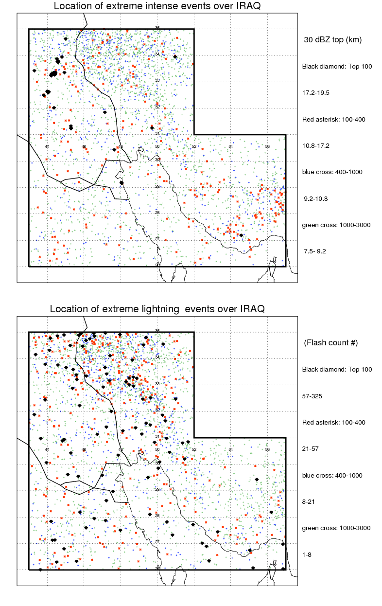 Following figure shows the location of the precipitation feautres categorized by the lightning rate and 30 dBZ echo top.