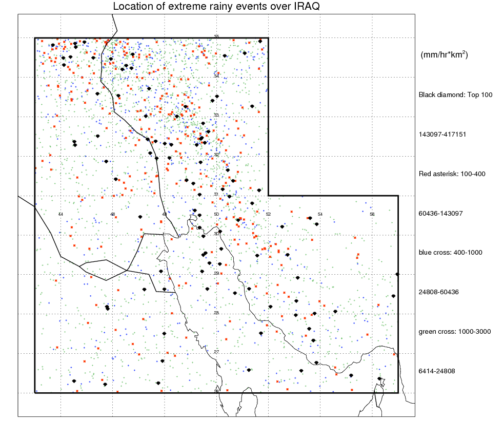 Following figure shows the location of the precipitation feautres categorized by the volumetric rainfall.
