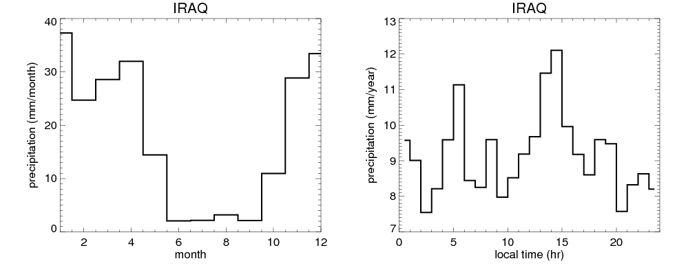 Over IRAQ , mean annual precipitation are estimated with 219.9 (mm/year) from precipitation radar, and 149.2 (mm/year) from microwave radiometer observations. (see high resolution precipitation product , NOTE: it may take long time to generate for large area) In total, thunderstorms (systems with detected lightning flashes) contribute 49 %, MCSs (Mesoscale convective systems with raining area > 2000 km^2) contribute 73 % of all precipitation. Seasonal and diurnal variations of rainfall over IRAQ are shown in following figure. You may check the details of rainfall contributions from precipitation systems with different sizes and intensities in various seasons and at different local times. |