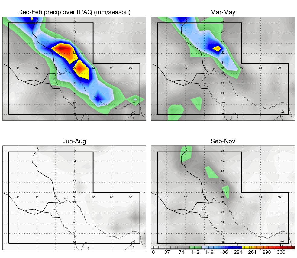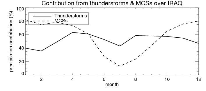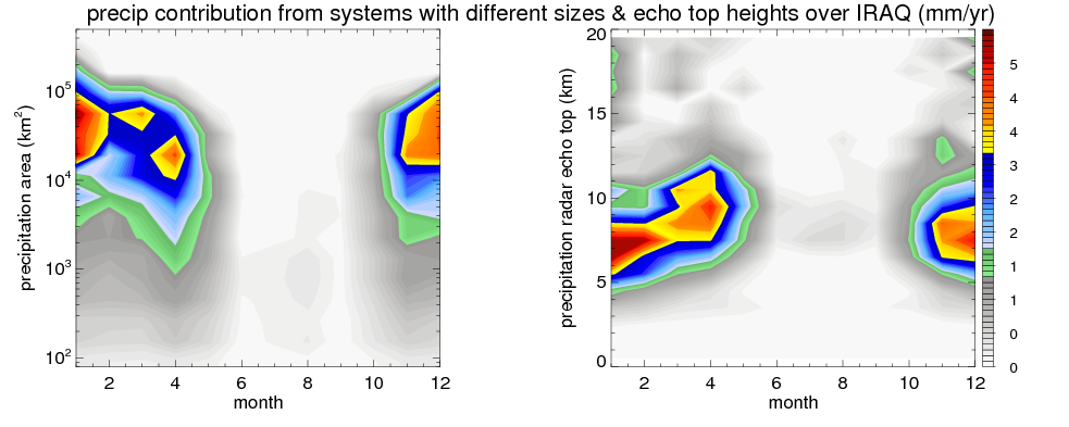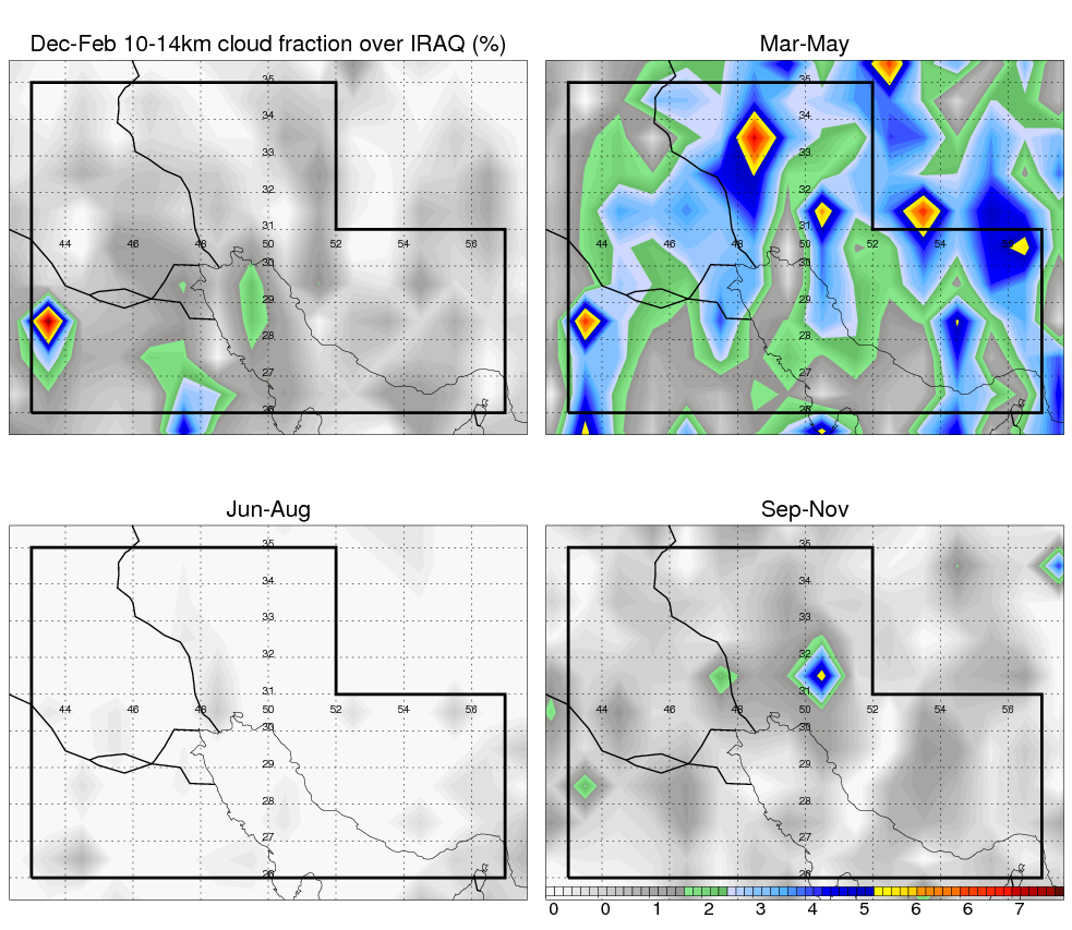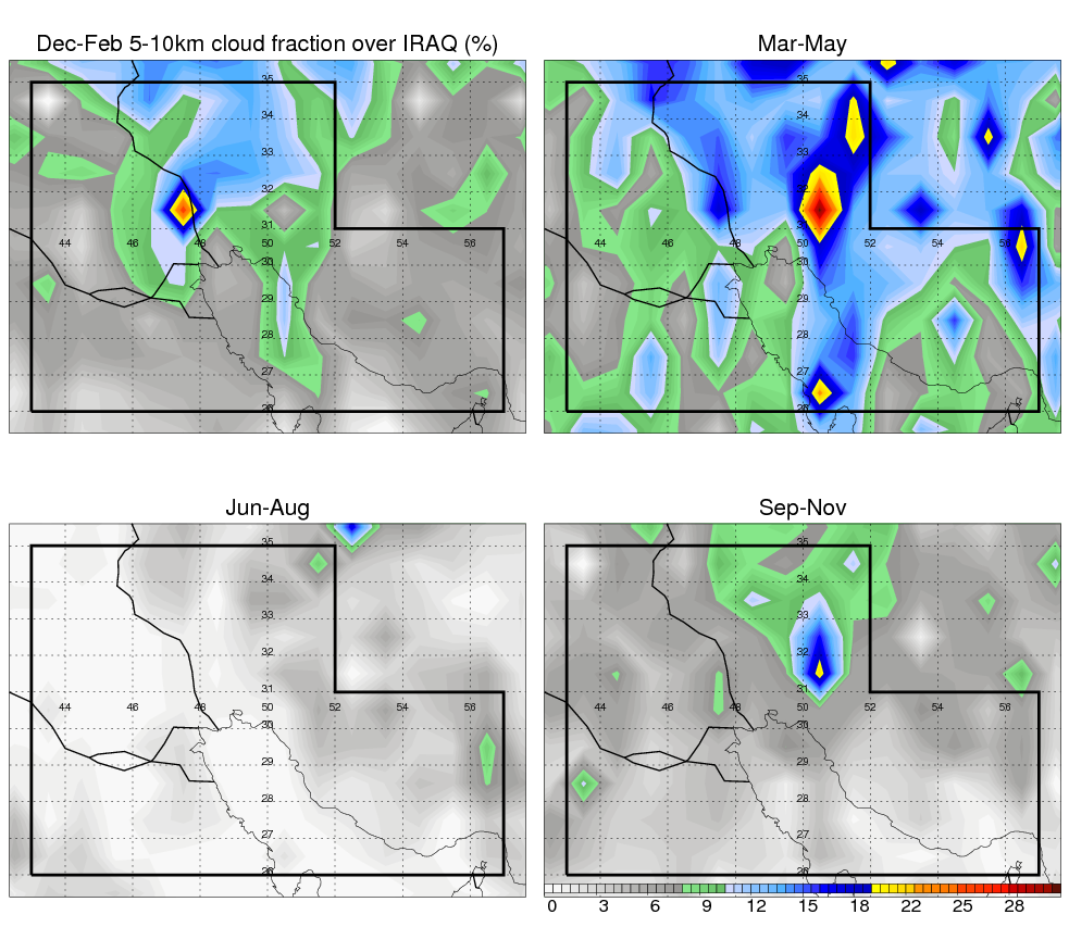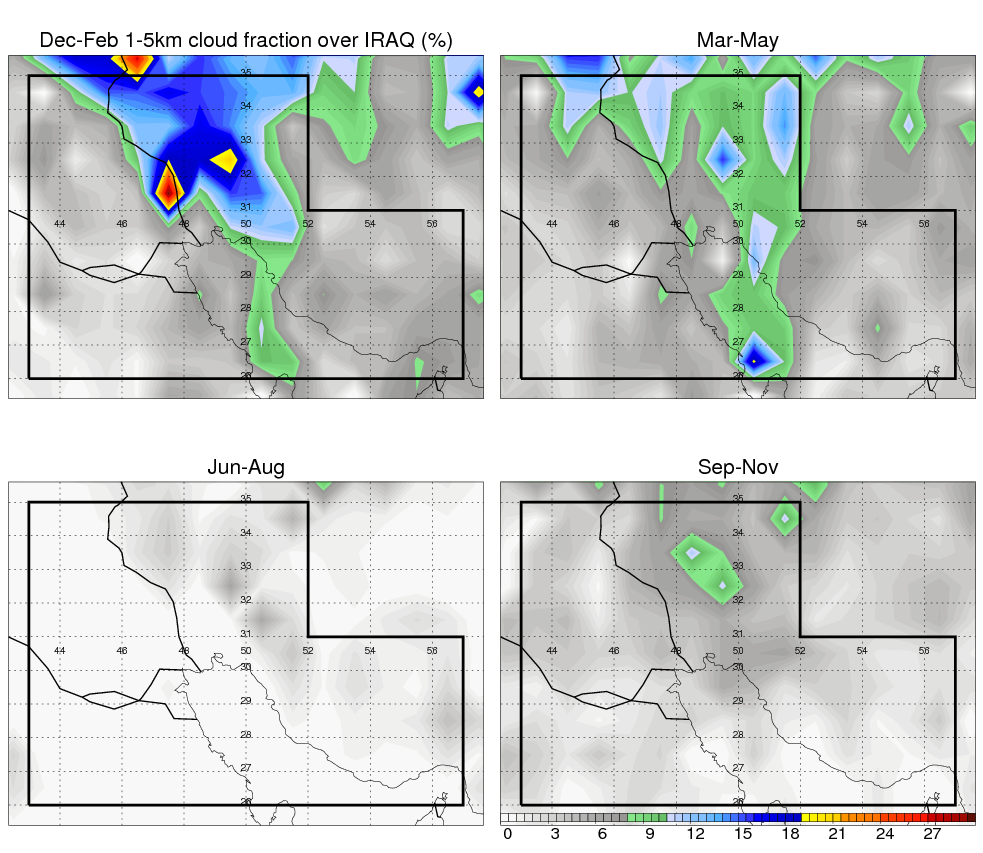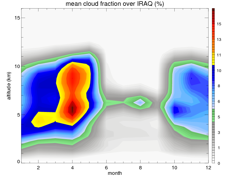 Over IRAQ , mean annual precipitation are estimated with 219.9 (mm/year) from TRMM precipitation radar. (distribution of precipitation see here ) Total surface rainfall is brought by various precipitation systems. The seasonal variation of precipitation from systems with different sizes and heights are shown below: In total, thunderstorms (systems with detected lightning flashes) contribute 49 %, MCSs (Mesoscale convective systems with raining area > 2000 km^2) contribute 73 % of all precipitation. Seasonal variations of fraction of precipitation from thunderstorms and MCSs are shown below: The seasonal variation of geographical distribution of CloudSat cloud fraction over IRAQ is shown below: The seasonal variation of mean CloudSat level cloud fraction at different altitudes over IRAQ is shown below: |